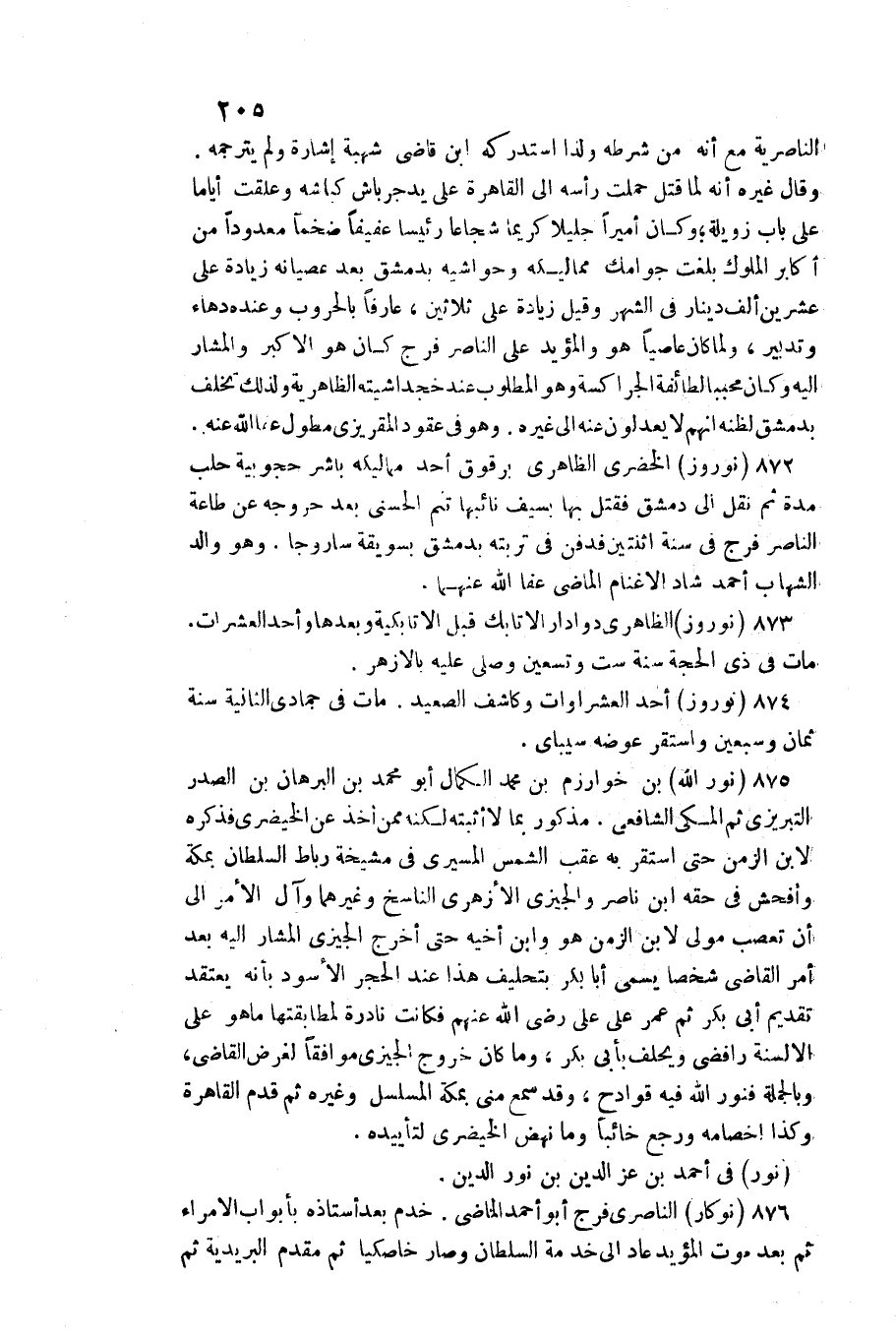 876 - نوكار الناصري فرج أَبُو أَحْمد الْمَاضِي. / خدم بعد أستاذه بِأَبْوَاب الْأُمَرَاء ثمَّ بعد موت الْمُؤَيد عَاد إِلَى خدمَة السُّلْطَان وَصَارَ خاصكيا ثمَّ مقدم البريدية ثمَّ