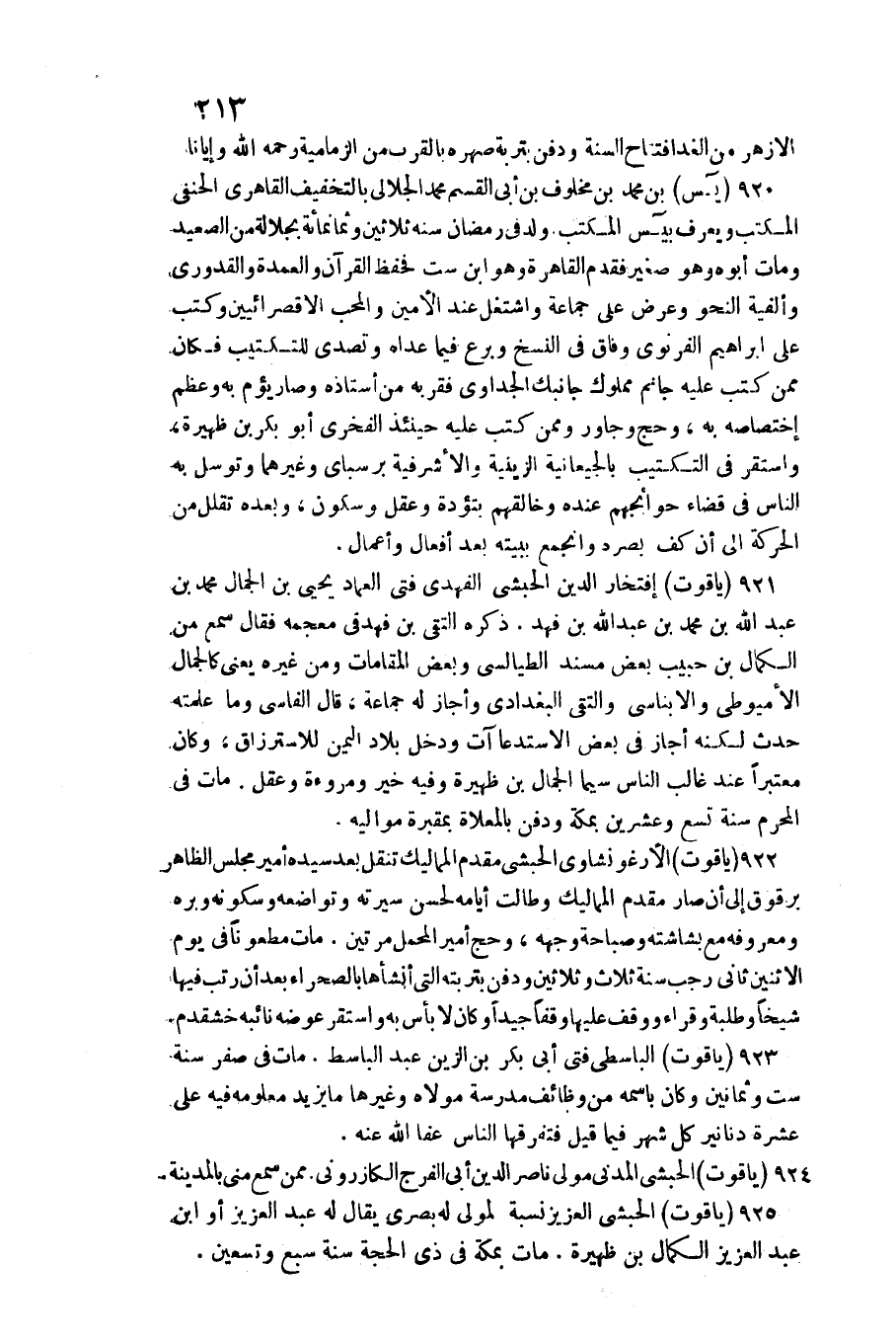 925 - ياقوت الحبشي نِسْبَة لمولى لَهُ بَصرِي يُقَال لَهُ عبد الْعَزِيز أَو ابْن عبد الْعَزِيز الْكَمَال بن ظهيرة. / مَاتَ بِمَكَّة فِي ذِي الْحجَّة سنة سبع وَتِسْعين.