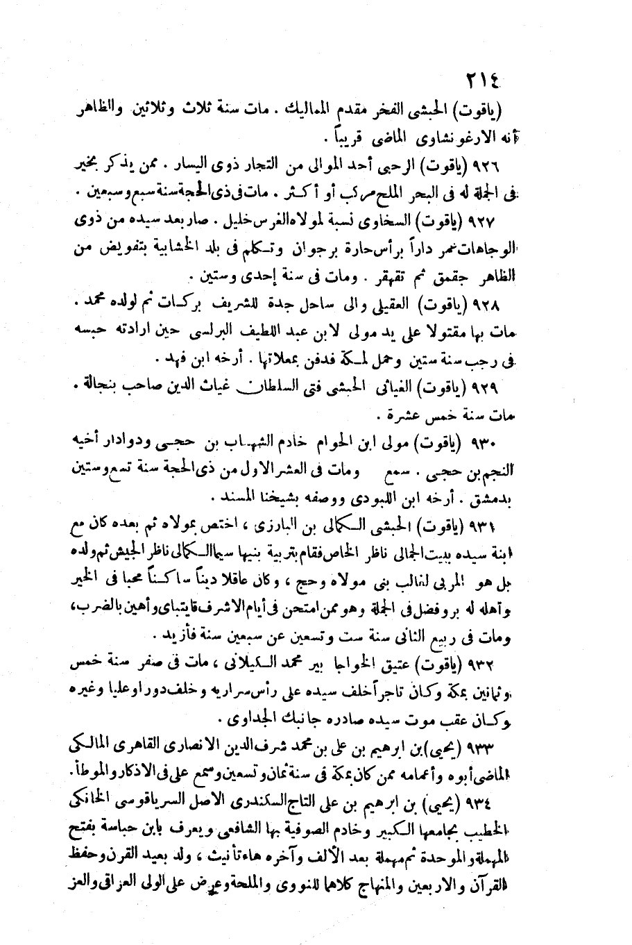 926 - ياقوت الرَّحبِي أحد الموَالِي / من التُّجَّار ذَوي الْيَسَار. مِمَّن يذكر بِخَير فِي الْجُمْلَة لَهُ فِي الْبَحْر الملج مركب أَو أَكثر. مَاتَ فِي ذِي الْحجَّة سنة سبع وَسبعين.