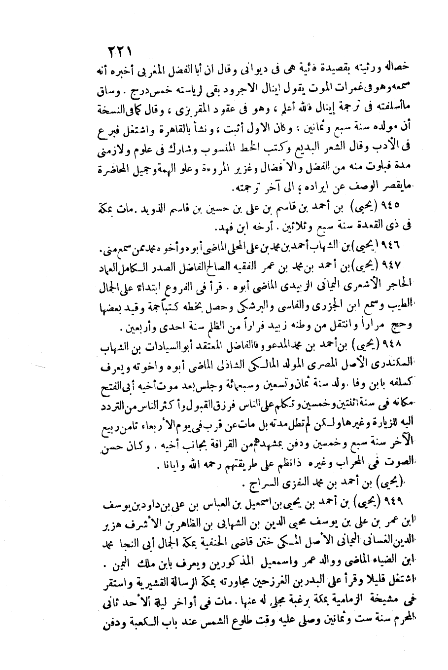 949 - يحيى بن أَحْمد بن يحيى بن إِسْمَعِيل بن الْعَبَّاس بن عَليّ بن دَاوُد بن يُوسُف بن عمر بن عَليّ بن يُوسُف محيي الدّين بن الشهابي بن الظَّاهِر بن الْأَشْرَف هزبر الدّين الغساني الْيَمَانِيّ الأَصْل الْمَكِّيّ ختن قَاضِي الْحَنَفِيَّة بِمَكَّة الْجمال أبي النجا مُحَمَّد بن الضياء الْمَاضِي ووالد عمر وإسمعيل الْمَذْكُورين وَيعرف بِابْن ملك الْيمن. / اشْتغل قَلِيلا وَقَرَأَ على الْبَدْر بن)