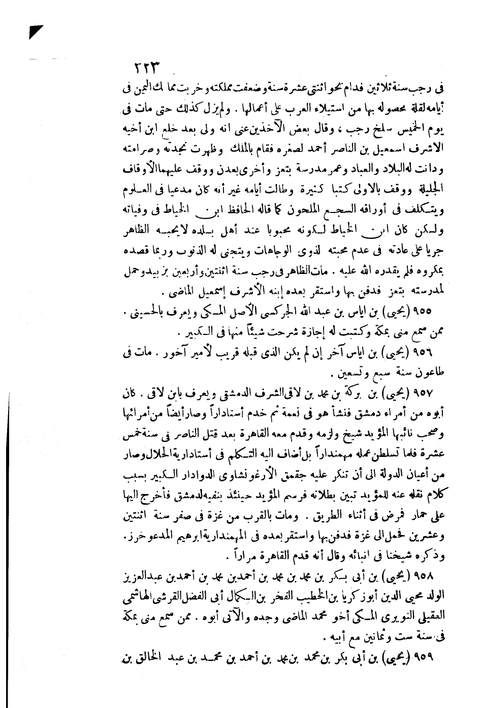 957 - يحيى بن بركَة بن مُحَمَّد بن لاقي الشّرف الدِّمَشْقِي وَيعرف بِابْن لاقي. / كَانَ أَبوهُ من أُمَرَاء دمشق فَنَشَأَ هُوَ فِي نعْمَة ثمَّ خدم أستادارا وَصَارَ أَيْضا من أمرائها وَصَحب نائبها الْمُؤَيد شيخ وَلَزِمَه وَقدم مَعَه الْقَاهِرَة بعد قتل النَّاصِر فِي سنة خمس عشرَة فَلَمَّا تسلطن عمله مهمندارا بل أضَاف بل أضَاف إِلَيْهِ التَّكَلُّم فِي أستادارية الْحَلَال وَصَارَ من أَعْيَان الدولة إِلَى أَن تنكر عَلَيْهِ جقمق الأرغونشاوي الدوادار الْكَبِير بِسَبَب كَلَام نَقله عَنهُ للمؤيد تبين بُطْلَانه فرسم الْمُؤَيد حِينَئِذٍ بنفيه لدمشق فَأخْرج إِلَيْهَا على حمَار فَمَرض فِي أثْنَاء الطَّرِيق. وَمَات بِالْقربِ من غَزَّة فِي صفر سنة اثْنَتَيْنِ وَعشْرين فَحمل إِلَى غَزَّة فَدفن بهَا وَاسْتقر بعده فِي المهمندارية)