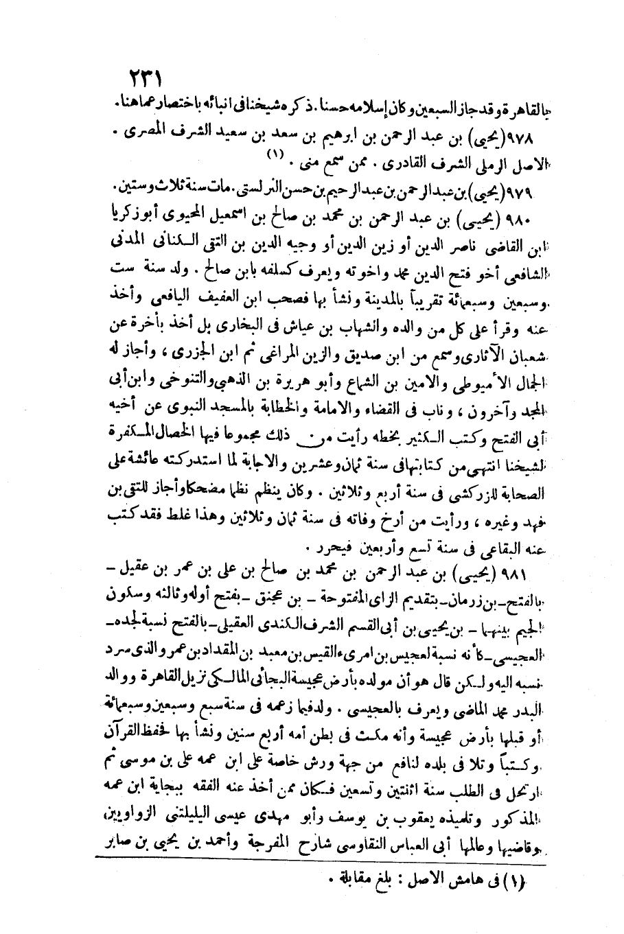 980 - يحيى بن عبد الرَّحْمَن بن مُحَمَّد بن صَالح بن إِسْمَعِيل المحيوي أَبُو زَكَرِيَّا ابْن القَاضِي نَاصِر الدّين أَو زين الدّين أَو وجيه الدّين بن التقي الْكِنَانِي الْمدنِي الشَّافِعِي أَخُو فتح الدّين مُحَمَّد وَإِخْوَته وَيعرف كسلفه بِابْن صَالح. / ولد سنة سِتّ وَسبعين وَسَبْعمائة تَقْرِيبًا بِالْمَدِينَةِ وَنَشَأ بهَا فصحب ابْن الْعَفِيف اليافعي وَأخذ عَنهُ وَقَرَأَ على كل من وَالِده والشهاب بن عَيَّاش فِي البُخَارِيّ بل أَخذ بِأخرَة عَن شعْبَان الآثاري وَسمع من ابْن صديق والزين المراغي ثمَّ ابْن)