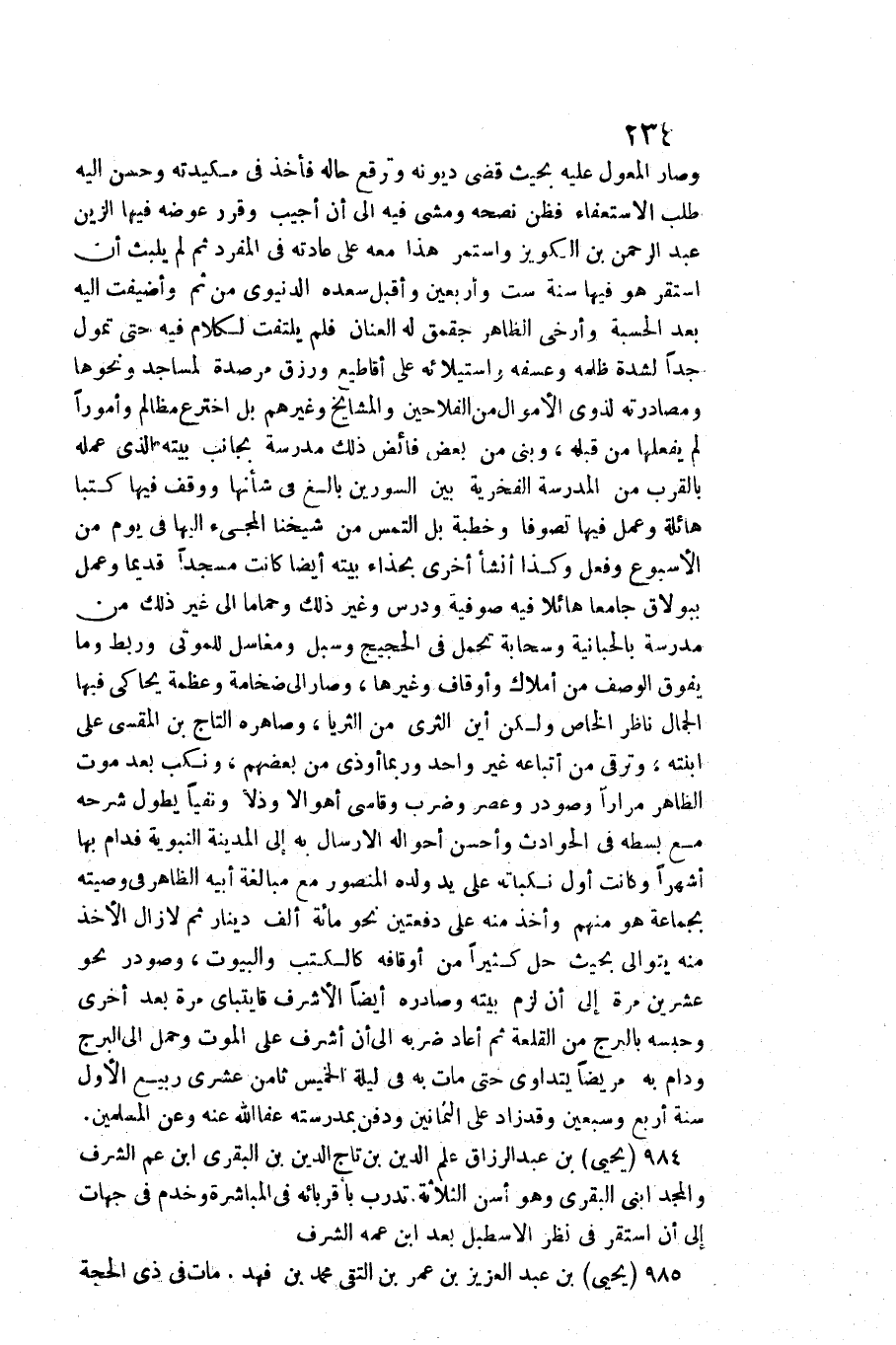 وَصَارَ الْمعول عَلَيْهِ بِحَيْثُ قضى دُيُونه وترقع حَاله فَأخذ فِي مكيدته وَحسن إِلَيْهِ طلب الاستعفاء فَظن نصحه وَمَشى فِيهِ إِلَى أَن أُجِيب وَقرر عوضه فِيهَا الزين عبد الرَّحْمَن بن الكويز وَاسْتمرّ هَذَا مَعَه على عَادَته فِي الْمُفْرد ثمَّ لم يلبث أَن اسْتَقر هُوَ فِيهَا سنة سِتّ وَأَرْبَعين وَأَقْبل سعده الدنيوي من ثمَّ وأضيفت إِلَيْهِ بعد الْحِسْبَة وأرخى الظَّاهِر جقمق لَهُ الْعَنَان فَلم يلْتَفت لكَلَام فِيهِ حَتَّى تمول جدا لشدَّة ظلمه وعسفه واستيلائه على أقاطيع ورزق مرصدة لمساجد نَحْوهَا ومصادرته لِذَوي الْأَمْوَال من الفلاحين والمشايخ وَغَيرهم بل اخترع مظالم وأمورا لم يَفْعَلهَا من قبله، وَبني من بعض فائض ذَلِك مدرسة بِجَانِب بَيته الَّذِي)