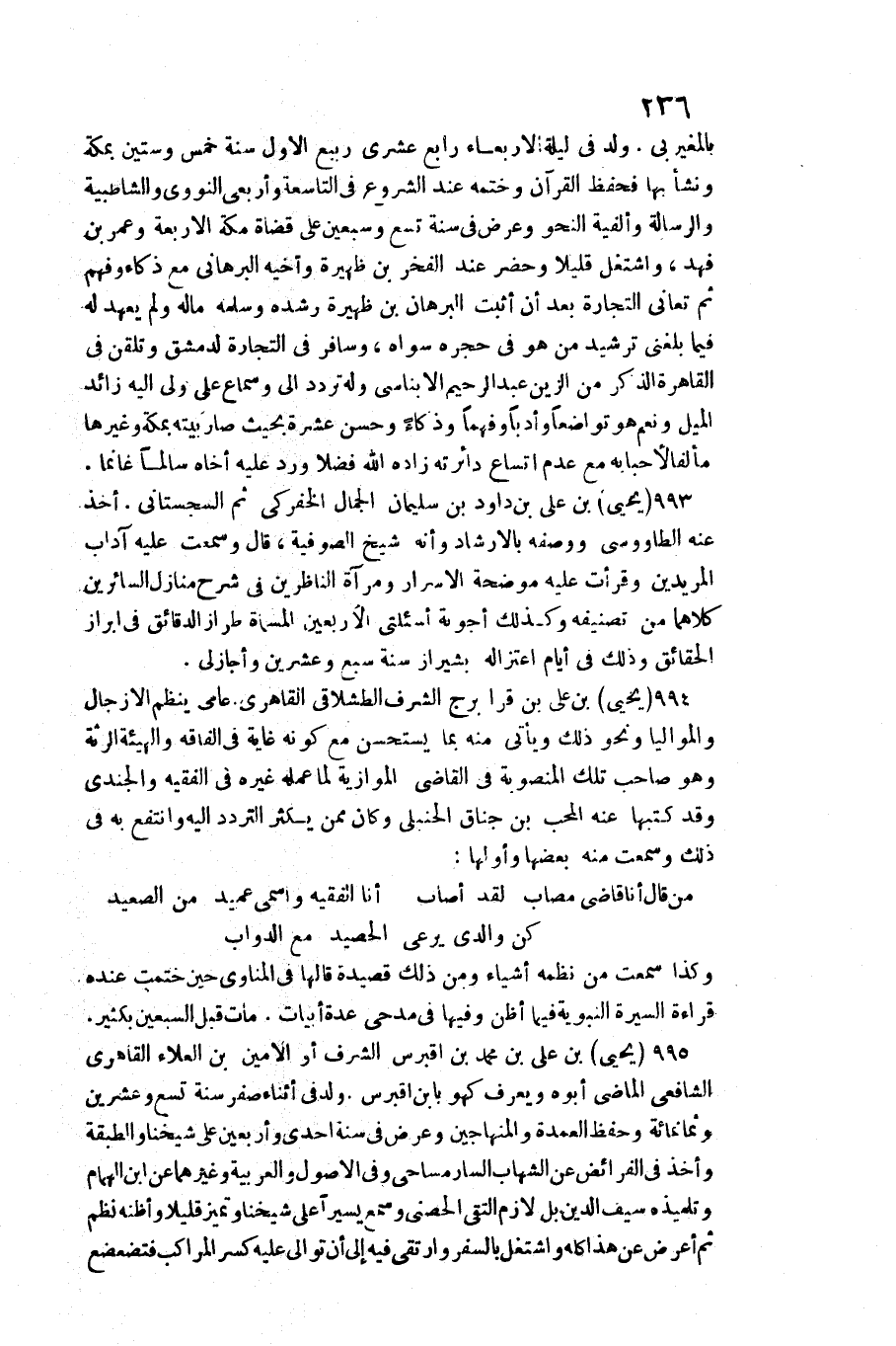 993 - يحيى بن عَليّ بن دَاوُد بن سُلَيْمَان الْجمال الخفركي ثمَّ السجسْتانِي. / أَخذ عَنهُ الطاووسي وَوَصفه بالإرشاد وَأَنه شيخ الصُّوفِيَّة، قَالَ وَسمعت عَلَيْهِ آدَاب المريدين وقرأت عَلَيْهِ مُوضحَة الْأَسْرَار وَأَنه شيخ الصُّوفِيَّة، قَالَ وَسمعت عَلَيْهِ آدَاب المريدين وقرأت عَلَيْهِ مُوضحَة الْأَسْرَار ومرآة الناظرين فِي شرح منَازِل السائرين كِلَاهُمَا من تصنيفه وَكَذَلِكَ أجوبة أسئلتي الْأَرْبَعين الْمُسَمَّاة طراز الدقائق فِي إبراز الْحَقَائِق وَذَلِكَ فِي أَيَّام اعتزاله بشيراز سنة سبع وَعشْرين وَأَجَازَ لي.
