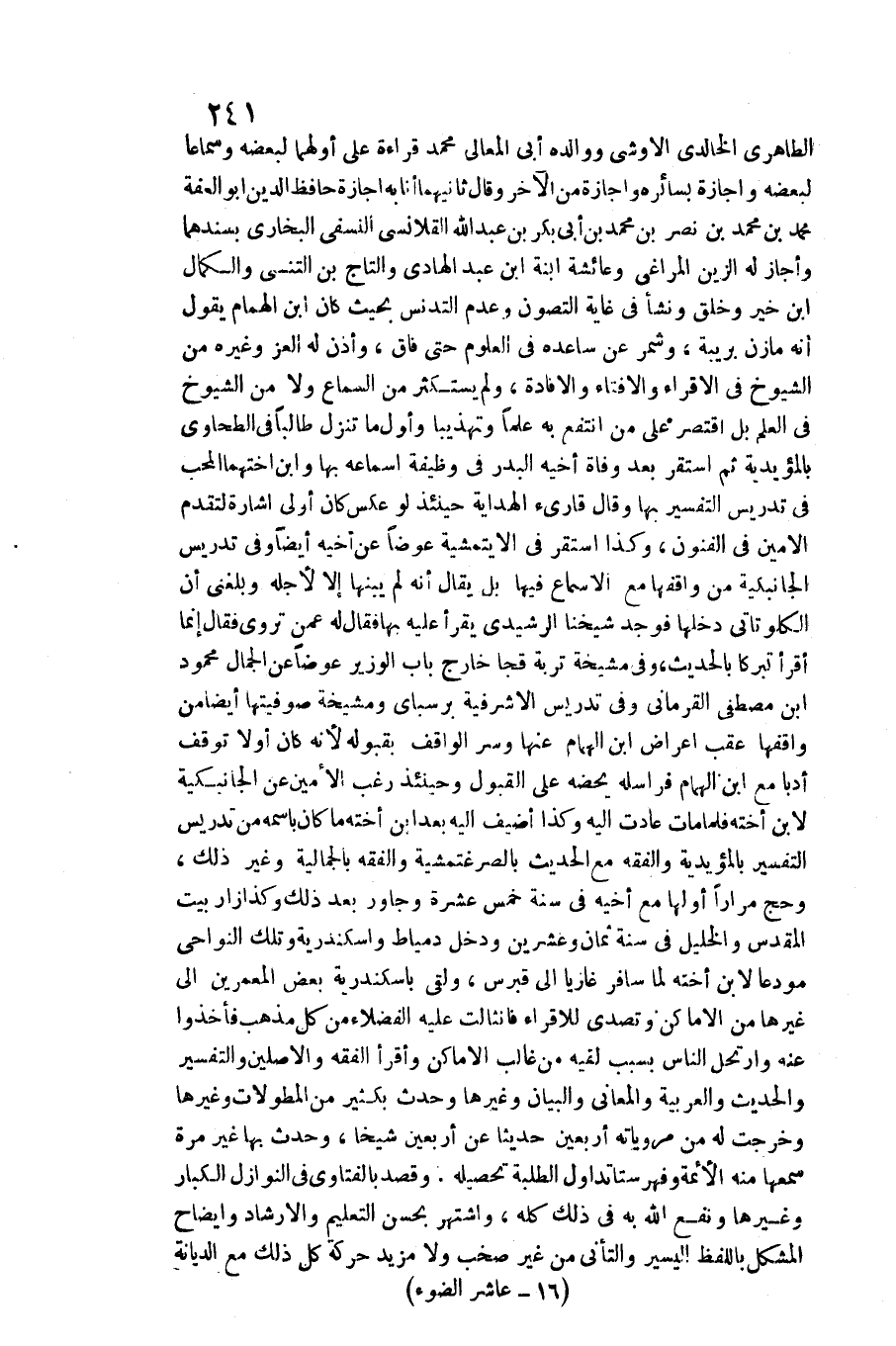 الطاهري الخالدي الأوشي ووالده أبي الْمَعَالِي مُحَمَّد قِرَاءَة على أَولهمَا لبعضه وسماعا لبعضه وإجازة بسائره وإجازة من الْآخِرَة وَقَالَ ثَانِيهمَا أَنا بِهِ إجَازَة حَافظ الدّين أَبُو الْعِفَّة مُحَمَّد بن مُحَمَّد بن نصر بن مُحَمَّد بن أبي بكر بن عبد الله القلانسي النَّسَفِيّ البُخَارِيّ بسندهما وَأَجَازَ لَهُ الزين المراغي وَعَائِشَة ابْنة ابْن عبد الْهَادِي والتاج بن التنسي والكمال ابْن خير وَخلق وَنَشَأ فِي غَايَة التصون وَعدم التدنس بِحَيْثُ كَانَ ابْن الْهمام يَقُول أَنه مَازِن بريبة، وشمر عَن ساعده فِي الْعُلُوم حَتَّى فاق، وَأذن لَهُ الْعِزّ وَغَيره من الشُّيُوخ فِي الإقراء والإفتاء والإفادة، وَلم يستكثر من السماع وَلَا من الشُّيُوخ فِي الْعلم بل اقْتصر على من انْتفع بِهِ علما وتهذيبا وَأول مَا تنزل طَالبا فِي الطَّحَاوِيّ بالمؤيدية ثمَّ اسْتَقر بعد وَفَاة أَخِيه الْبَدْر فِي وَظِيفَة إسماعه بهَا وَابْن أختهما الْمُحب فِي تدريس التَّفْسِير بهَا وَقَالَ قَارِئ الْهِدَايَة حِينَئِذٍ لَو عكس كَانَ أولى إِشَارَة لتقدم الْأمين فِي الْفُنُون، وَكَذَا اسْتَقر فِي الإيتمشية عوضا عَن أَخِيه أَيْضا وَفِي تدريس الجانبكية من واقفها مَعَ الإسماع فِيهَا بل يُقَال أَنه لم يبنها إِلَّا لأَجله وَبَلغنِي أَن الكلوتات دَخلهَا فَوجدَ شَيخنَا الرَّشِيدِيّ يقْرَأ عَلَيْهِ بهَا فَقَالَ لَهُ عَمَّن تروي فَقَالَ إِنَّمَا أَقرَأ تبركا بِالْحَدِيثِ، وَفِي مشيخة تربة قجا خَارج بَاب الْوَزير عوضا عَن الْجمال مَحْمُود بن مصطفى القرماني وَفِي تدريس الأشرفية برسباي ومشيخة صوفيتها أَيْضا من واقفها عقب إِعْرَاض ابْن الْهمام عَنْهَا وسر الْوَاقِف بقبوله لِأَنَّهُ كَانَ أَولا توقف أدبا مَعَ ابْن الْهمام فراسله يحضه على الْقبُول وَحِينَئِذٍ رغب الْأمين عَن الجانبكية لِابْنِ أُخْته فَلَمَّا مَاتَ عَادَتْ إِلَيْهِ وَكَذَا أضيف إِلَيْهِ بعد ابْن أُخْته مَا كَانَ باسمه من تدريس التَّفْسِير بالمؤيدية وَالْفِقْه مَعَ الحَدِيث بالصرغتمشية وَالْفِقْه بالجمالية وَغير ذَلِك، وَحج مرَارًا أَولهَا مَعَ أَخِيه فِي سنة خمس عشرَة وجاور بعد ذكل وَكَذَا زار بَيت الْمُقَدّس والخليل فِي سنة ثَمَان وَعشْرين وَدخل دمياط وإسكندرية وَتلك النواحي مودعا لِابْنِ أُخْته لما سَافر غازيا إِلَى قبرس، وَلَقي بإسكندرية بعض المعمرين إِلَى غَيرهَا من)