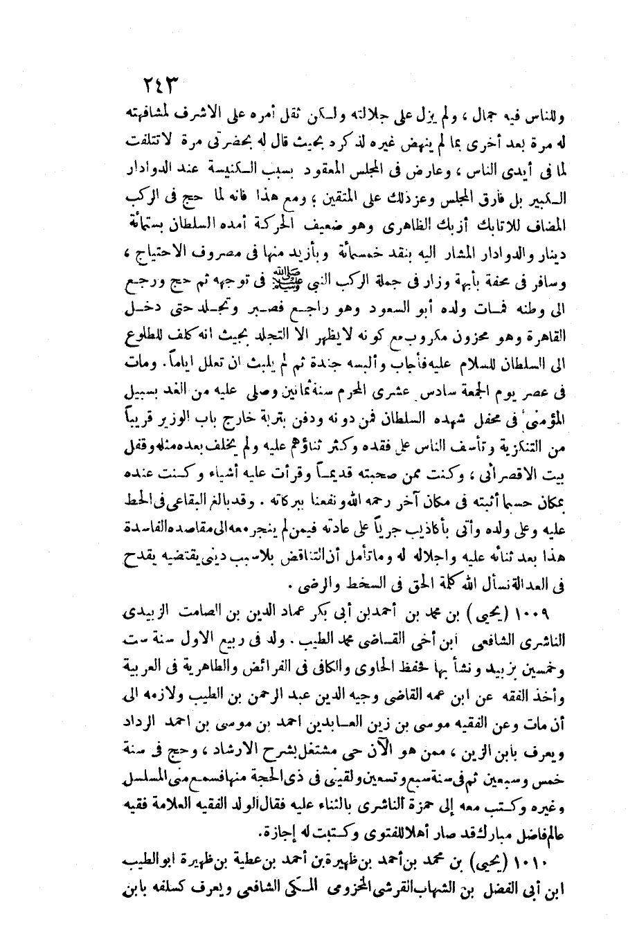 1009 - يحيى بن مُحَمَّد بن أَحْمد بن أبي بكر عماد الدّين بن الصَّامِت الزبيدِيّ النَّاشِرِيّ الشَّافِعِي ابْن أخي القَاضِي مُحَمَّد الطّيب. / ولد فِي ربيع الأول سنة سِتّ وَخمسين بزبيد وَنَشَأ بهَا فحفظ الْحَاوِي وَالْكَافِي فِي الْفَرَائِض والطاهرية فِي الْعَرَبيَّة وَأخذ الْفِقْه عَن ابْن عَمه القَاضِي)