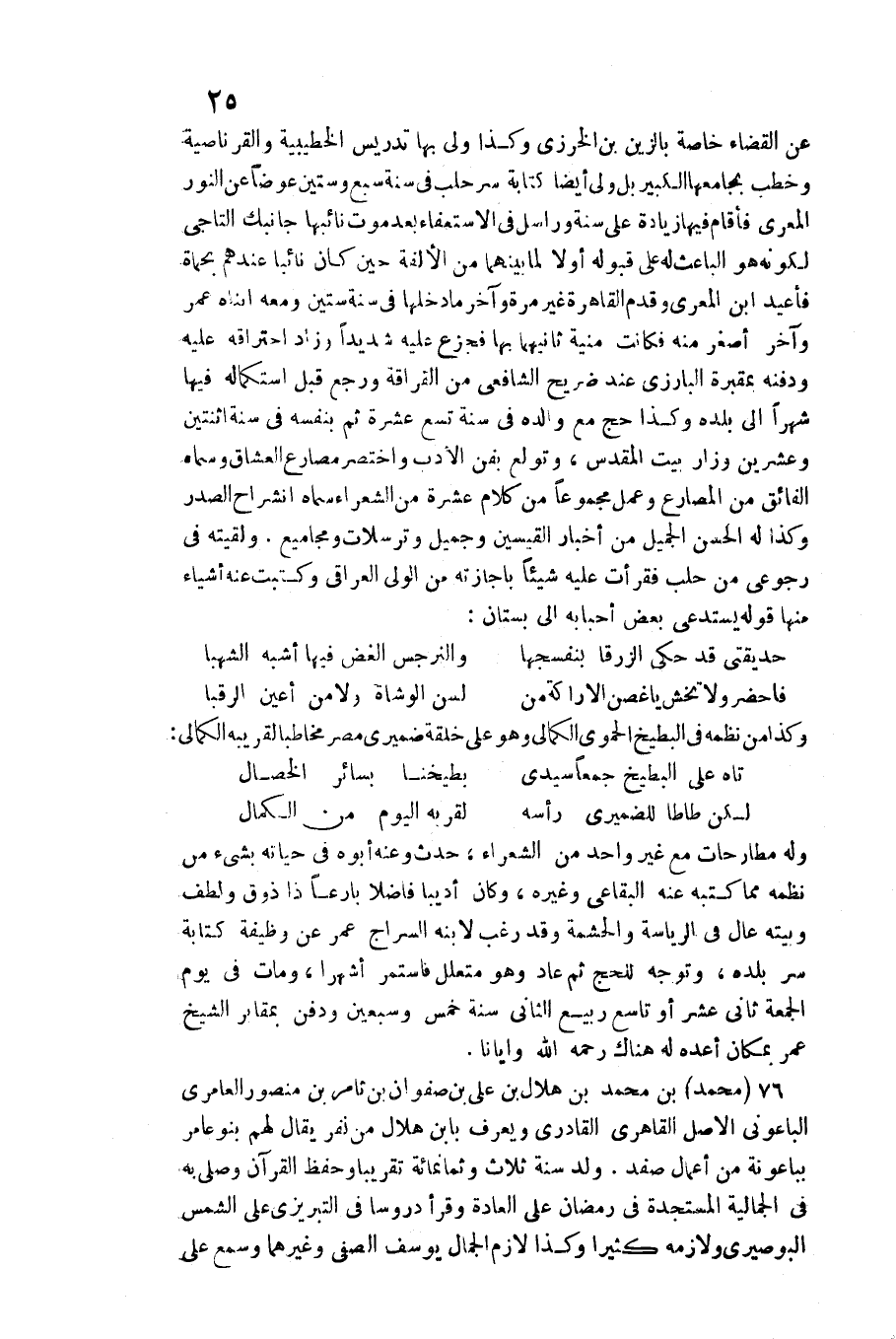 76 - مُحَمَّد بن مُحَمَّد بن هِلَال بن عَليّ بن صَفْوَان بن تامر بن مَنْصُور العامري الباعوني الأَصْل القاهري القادري وَيعرف بِابْن هِلَال / من نفر يُقَال لَهُم بَنو عَامر بباعونة من أَعمال صفد. ولد سنة ثَلَاث وَثَمَانمِائَة تَقْرِيبًا وَحفظ الْقُرْآن وَصلى بِهِ فِي الجمالية المستجدة فِي رَمَضَان على الْعَادة وَقَرَأَ دروسا فِي التبريزي على الشَّمْس البوصيري ولازمه كثيرا وَكَذَا لَازم الْجمال يُوسُف الصفي وَغَيرهمَا وَسمع على