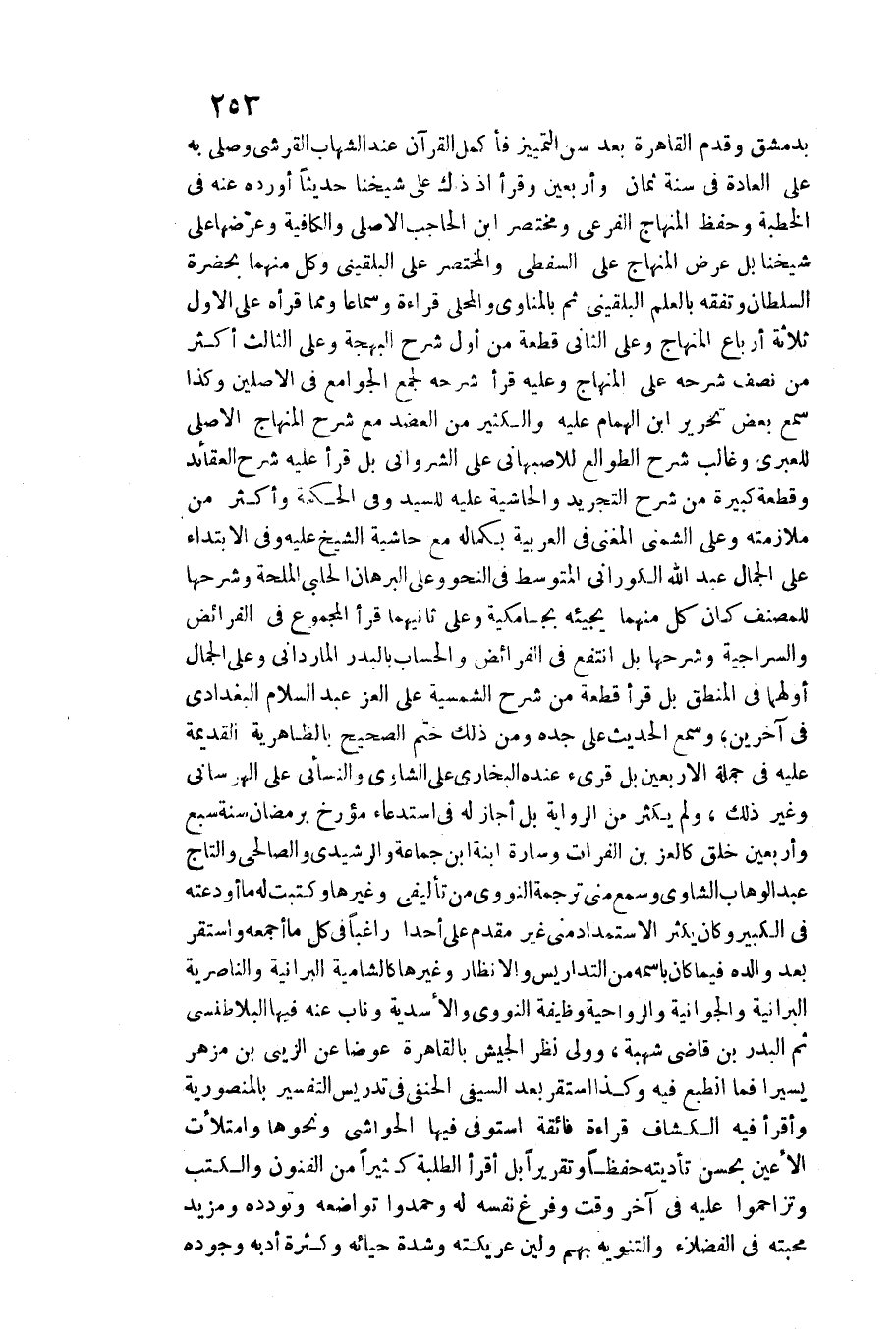 والسراجية وَشَرحهَا بل انْتفع فِي الْفَرَائِض والحساب بالبدر المارداني وعَلى الْجمال أَولهمَا فِي الْمنطق بل قَرَأَ قِطْعَة من شرح الشمسية على الْعِزّ عبد السَّلَام الْبَغْدَادِيّ فِي آخَرين وَسمع الحَدِيث على جده وَفِي ذَلِك ختم الصَّحِيح بالظاهرية الْقَدِيمَة عَلَيْهِ فِي جملَة الْأَرْبَعين بل قرئَ عِنْده البُخَارِيّ على الشاوي وَالنَّسَائِيّ على الهرساني وَغير ذَلِك، وَلم يكثر من الرِّوَايَة بل أجَاز لَهُ فِي استدعاء مؤرخ برمضان سنة سبع وَأَرْبَعين خلق كالعز بن الْفُرَات وَسَارة ابْنة ابْن جمَاعَة والرشيدي والصالحي والتاج عبد الْوَهَّاب الشاوي وَسمع مني تَرْجَمَة النَّوَوِيّ من تأليفي وَغَيرهَا وكتبت لَهُ مَا أودعته فِي الْكَبِير وَكَانَ يكثر الاستمداد مني غير مقدم على أحدا رَاغِبًا فِي كل مَا أجمعه وَاسْتقر بعد وَالِده فِيمَا كَانَ باسمه من التداريس والأنظار وَغَيرهَا كالشامية البرانية والناصرية البرانية والجوانية والرواحية وَظِيفَة النَّوَوِيّ والأسدية وناب عَنهُ فيخا البلاطنسي ثمَّ الْبَدْر بن قَاضِي شُهْبَة، وَولي نظر الْجَيْش بِالْقَاهِرَةِ عوضا عَن الزيني بن مزهر يَسِيرا فَمَا انطبع فِيهِ وَكَذَا اسْتَقر بعد السيفي الْحَنَفِيّ فِي تدريس التَّفْسِير بالمنصورية وأقرأ فِيهِ الْكَشَّاف قِرَاءَة فائقة استوفى فِيهَا الْحَوَاشِي وَنَحْوهَا وامتلأت الْأَعْين بِحسن تأديته حفظا وتقريرا بل أَقرَأ الطّلبَة كثيرا من الْفُنُون والكتب وتزاحموا عَلَيْهِ فِي آخر وَقت وَفرغ نَفسه لَهُ وحمدوا تواضعه وتودده ومزيد محبته فِي الْفُضَلَاء والتنويه بهم ولين عريكته وَشدَّة حيائه وَكَثْرَة أدبه وجوده