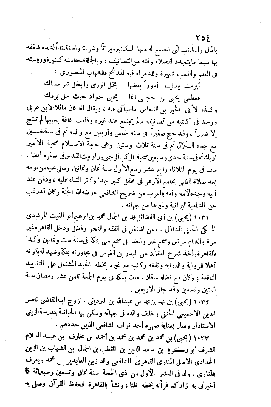 1033 - يحيى بن مُحَمَّد بن مُحَمَّد بن مُحَمَّد بن أَحْمد بن مخلوف بن عبد السَّلَام الشّرف أَبُو زَكَرِيَّا بن سعد الدّين بن القطب بن الْجمال بن الشهَاب بن الزين الحدادي الأَصْل الْمَنَاوِيّ القاهري الشَّافِعِي وَالِد زين العابدين مُحَمَّد وَيعرف بالمناوي. / ولد فِي الْعشْر الأول من ذِي الْحجَّة سنة ثَمَان وَتِسْعين وَسَبْعمائة كَمَا أَخْبرنِي بِهِ زَاد كَمَا قرأته بِخَطِّهِ ظنا، وَنَشَأ بِالْقَاهِرَةِ فحفظ الْقُرْآن وَصلى بِهِ
