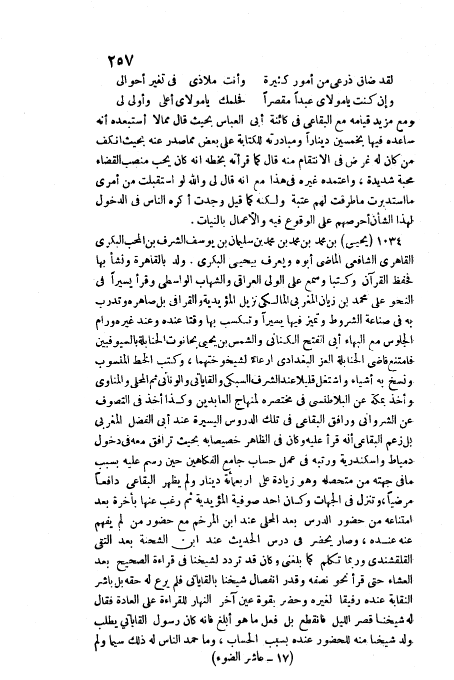 1034 - مُحَمَّد بن مُحَمَّد بن مُحَمَّد بن سُلَيْمَان بن يُوسُف الشّرف بن الْمُحب الْبكْرِيّ القاهري الشَّافِعِي الْمَاضِي أَبوهُ وَيعرف بِيَحْيَى الْبكْرِيّ. / ولد بِالْقَاهِرَةِ وَنَشَأ بهَا فحفظ الْقُرْآن وكتبا وَسمع على الْوَلِيّ الْعِرَاقِيّ والشهاب الوَاسِطِيّ وَقَرَأَ يَسِيرا فِي النَّحْو على مُحَمَّد بن زيان المغربي الْمَالِكِي نزيل المؤيدية والقرافي بل صاهره وتدرب بِهِ فِي صناعَة الشُّرُوط وتميز فِيهَا يَسِيرا وتكسب بهَا وقتا عِنْده وَعند غَيره ورام فَامْتنعَ قَاضِي الْحَنَابِلَة الْعِزّ الْبَغْدَادِيّ إرعاء لشيخوختهما، وَكتب الْخط الْمَنْسُوب وَنسخ بِهِ أَشْيَاء واشتغل قَلِيلا عِنْد الشّرف السُّبْكِيّ والقاياتي والونائي ثمَّ الْمحلي والمناوي وَأخذ بِمَكَّة عَن البلاطنسي فِي مُخْتَصره لمنهاج العابدين وَكَذَا أَخذ فِي التصوف عَن الشرواني ورافق البقاعي فِي تِلْكَ الدُّرُوس الْيَسِيرَة عِنْد أبي الْفضل المغربي بل زعم البقاعي أَنه قَرَأَ عَلَيْهِ وَكَانَ فِي الظَّاهِر خصيصا بِهِ بِحَيْثُ ترافق مَعَه فِي دُخُول دمياط وإسكندرية ورتبه فِي عمل حِسَاب جَامع الفكاهين حِين رسم عَلَيْهِ بِسَبَب مَا فِي جِهَته من متحصله وَهُوَ زِيَادَة على أَرْبَعمِائَة دِينَار وَلم يظْهر البقاعي دافعا مرضيا، وتنزل فِي الْجِهَات وَكَانَ أحد صوفية المؤيدية ثمَّ رغب عَنْهَا بِأخرَة بعد امْتِنَاعه من حُضُور الدَّرْس بعد الْمحلي عِنْد ابْن المرخم مَعَ حُضُور من لم يفهم عَنهُ عِنْده، وَصَارَ يحضر فِي درس الحَدِيث عِنْد ابْن الشّحْنَة بعد التقي القلقشندي وَرُبمَا تكلم كَمَا بَلغنِي وَكَانَ قد تردد لشَيْخِنَا فِي قِرَاءَة الصَّحِيح بعد الْعشَاء حَتَّى قَرَأَ نَحْو نصفه وَقدر انْفِصَال شَيخنَا بالقاياتي فَلم يرع لَهُ حَقه بل بَاشر النقابة عِنْده رَفِيقًا لغيره وَحضر بِقُوَّة عين آخر النَّهَار للْقِرَاءَة على الْعَادة فَقَالَ لَهُ شَيخنَا قصر اللَّيْل فَانْقَطع بل فعل مَا هُوَ أبلغ فَإِنَّهُ كَانَ رَسُول القاياتي يطْلب ولد شَيخنَا مِنْهُ للحضور عِنْده بِسَبَب الْحساب، وَمَا حمد النَّاس لَهُ ذَلِك سِيمَا وَلم