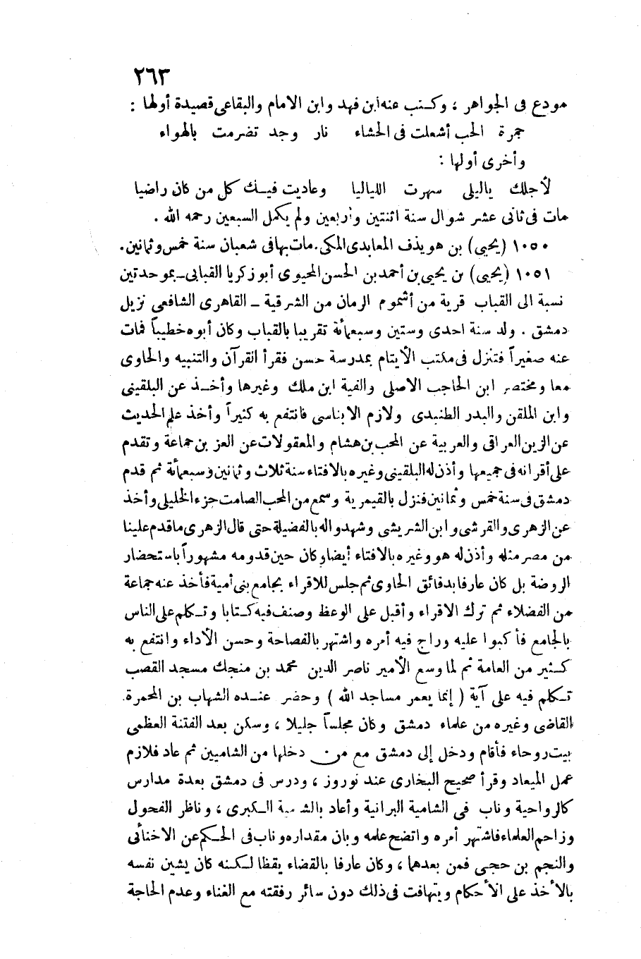 1051 - يحيى بن يحيى بن أَحْمد بن الْحسن المحيوي أَبُو زَكَرِيَّا القبابي بموحدتين نِسْبَة إِلَى قباب قَرْيَة من أشموم الرُّمَّان من الشرقية القاهري الشَّافِعِي نزيل دمشق. / ولد سنة إِحْدَى وَسِتِّينَ وَسَبْعمائة تَقْرِيبًا بالقباب وَكَانَ أَبوهُ خَطِيبًا فَمَاتَ عَنهُ صَغِيرا فتنزل فِي مكتب الْأَيْتَام بمدرسة حسن فَقَرَأَ الْقُرْآن والتنبيه وَالْحَاوِي مَعًا ومختصر ابْن الْحَاجِب الْأَصْلِيّ وألفية ابْن ملك وَغَيرهَا وَأخذ عَن البُلْقِينِيّ وَابْن الملقن والبدر الطنبدي ولازم الأبناسي فَانْتَفع بِهِ كثيرا وَأخذ علم الحَدِيث عَن الزين الْعِرَاقِيّ والعربية عَن الْمُحب بن هِشَام والمعقولات عَن الْعِزّ بن جمَاعَة وَتقدم على أقرانه فِي جَمِيعهَا وَأذن لَهُ البُلْقِينِيّ وَغَيره بالإفتاء سنة ثَلَاث وَثَمَانِينَ وَسَبْعمائة ثمَّ قدم دمشق فِي سنة خمس وَثَمَانِينَ فَنزل بالقيمرية وَسمع من الْمُحب الصَّامِت جُزْء الخليلي وَأخذ عَن الزُّهْرِيّ والقرشي وَابْن الشريشي وشهدوا لَهُ بالفضيلة حَتَّى قَالَ الزُّهْرِيّ مَا قدم علينا من مصر مثله وَأذن لَهُ هُوَ وَغَيره بالإفتاء أَيْضا وَكَانَ حِين قدومه مَشْهُورا باستحضار الرَّوْضَة بل كَانَ عَارِفًا بدقائق الْحَاوِي ثمَّ جلس للإقراء بِجَامِع بني أُميَّة فَأخذ عَنهُ جمَاعَة من الْفُضَلَاء ثمَّ ترك الإقراء وَأَقْبل على الْوَعْظ وصنف فِيهِ كتابا وَتكلم على النَّاس بالجامع فأكبوا عَلَيْهِ وراج فِيهِ أمره واشتهر بالفصاحة وَحسن الْأَدَاء وانتفع بِهِ كثير من الْعَامَّة ثمَّ لما وسع الْأَمِير نَاصِر الدّين مُحَمَّد بن منجك مَسْجِد الْقصب تكلم فِيهِ على آيَة إِنَّمَا يعمر مَسَاجِد الله وَحضر عِنْده الشهَاب بن المحمرة القَاضِي وَغَيره من عُلَمَاء دمشق وَكَانَ مَجْلِسا جَلِيلًا، وَسكن بعد الْفِتْنَة الْعُظْمَى بَيت روحاء فَأَقَامَ وَدخل إِلَى دمشق مَعَ من دَخلهَا من الشاميين ثمَّ عَاد فلازم عمل الميعاد وَقَرَأَ صَحِيح البُخَارِيّ عِنْد نوروز، ودرس فِي دمشق بعدة مدارس كالرواحية وناب فِي الشامية البرانية وَأعَاد بالشامية الْكُبْرَى، وناظر الفحول وزاحم الْعلمَاء فاشتهر أمره واتضح علمه وَبَان مِقْدَاره وناب فِي الحكم عَن الأخنائي والنجم بن حجي فَمن بعدهمَا، وَكَانَ عَارِفًا بِالْقضَاءِ يقظا لكنه كَانَ يشين نَفسه بِالْأَخْذِ على الْأَحْكَام ويتهافت فِي ذَلِك)