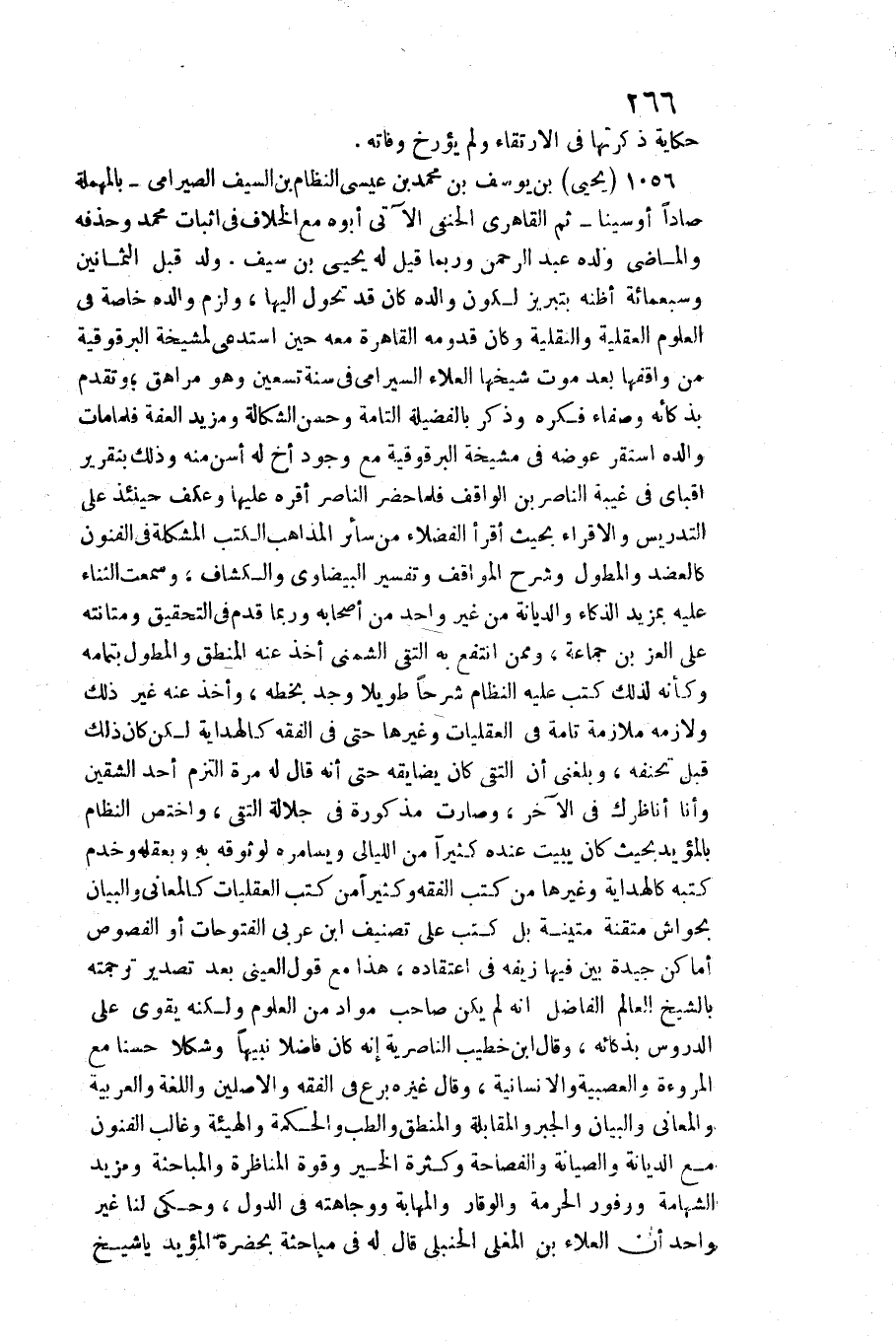 1056 - يحيى بن يُوسُف ين مُحَمَّد بن عِيسَى النظام بن السَّيْف الصيرامي بِالْمُهْمَلَةِ صادا أَو سينا ثمَّ القاهري الْحَنَفِيّ / الْآتِي أَبوهُ مَعَ الْخلاف فِي إِثْبَات مُحَمَّد وحذفه والماضي وَلَده عبد الرَّحْمَن وَرُبمَا قيل لَهُ يحيى بن سيف. ولد قبل الثَّمَانِينَ وَسَبْعمائة أَظُنهُ بتبريز لكَون وَالِده كَانَ قد تحول إِلَيْهَا، وَلزِمَ وَالِده خَاصَّة فِي الْعُلُوم الْعَقْلِيَّة والنقلية وَكَانَ قدومه الْقَاهِرَة مَعَه حِين استدعى لمشيخة البرقوقية من واقفها بعد موت شيخها الْعَلَاء السيرامي فِي سنة تسعين وَهُوَ مراهق وَتقدم بذكائه وصفاء فكره وَذكر بالفضيلة التَّامَّة وَحسن الشكالة ومزيد الْعِفَّة فَلَمَّا مَاتَ وَالِده اسْتَقر عوضه فِي مشيخة البرقوقية مَعَ وجود أَخ لَهُ أسن مِنْهُ وَذَلِكَ بنقرير أقباي فِي غيبَة النَّاصِر بن الْوَاقِف فَلَمَّا حضر النَّاصِر أقره عَلَيْهَا وَعَكَفَ حِينَئِذٍ على التدريس والإقراء بِحَيْثُ أَقرَأ الْفُضَلَاء من سَائِر الْمذَاهب الْكتب المشكلة فِي الْفُنُون كالعضد والمطول وَشرح المواقف وَتَفْسِير الْبَيْضَاوِيّ والكشاف، وَسمعت الثَّنَاء عَلَيْهِ بمزيد الذكاء والديانة من غير وَاحِد من أَصْحَابه وَرُبمَا قدم فِي التَّحْقِيق ومتانته على الْعِزّ بن جمَاعَة، وَمِمَّنْ انْتفع بِهِ التقي الشمني أَخذ عَنهُ الْمنطق والمطول بِتَمَامِهِ وَكَأَنَّهُ لذَلِك كتب عَلَيْهِ النظام شرحا طَويلا وجد بِخَطِّهِ، وَأخذ عَنهُ غير ذَلِك ولازمه مُلَازمَة تَامَّة فِي العقليات وَغَيرهَا حَتَّى فِي الْفِقْه كالهداية لَكِن كَانَ ذَلِك قبل تحنقه، وَبَلغنِي أَن التقي كَانَ يضايقه حَتَّى أَنه قَالَ لَهُ مرّة الْتزم أحد الشقين وَأَنا أناظرك فِي الآخر، وَصَارَت مَذْكُورَة فِي جلالة التقي، واختص النظام بالمؤيد بِحَيْثُ كَانَ يبيت عِنْده كثيرا من اللَّيَالِي ويسامره لوثوقه بِهِ وبعقله وخدم كتبه كالهداية وَغَيرهَا من كتب الْفِقْه وَكَثِيرًا من كتب العقليات كالمعاني وَالْبَيَان بحواش متقنة متينة بل كتب على تصنيف ابْن عَرَبِيّ الفتوحات أَو الفصوص أَمَاكِن جَيِّدَة بَين فِيهَا زيفه فِي اعْتِقَاده، هَذَا مَعَ قَول الْعَيْنِيّ بعد تصدير تَرْجَمته بالشيخ الْعَالم الْفَاضِل أَنه لم يكن صَاحب مواد من الْعُلُوم وَلكنه يقوى على الدُّرُوس بذكائه، وَقَالَ ابْن خطيب الناصرية إِنَّه كَانَ فَاضلا نبيها وشكلا حسنا مَعَ الْمُرُوءَة والعصبية والإنسانية، وَقَالَ غَيره برع فِي الْفِقْه والأصلين واللغة والعربية والمعاني وَالْبَيَان والجبر)