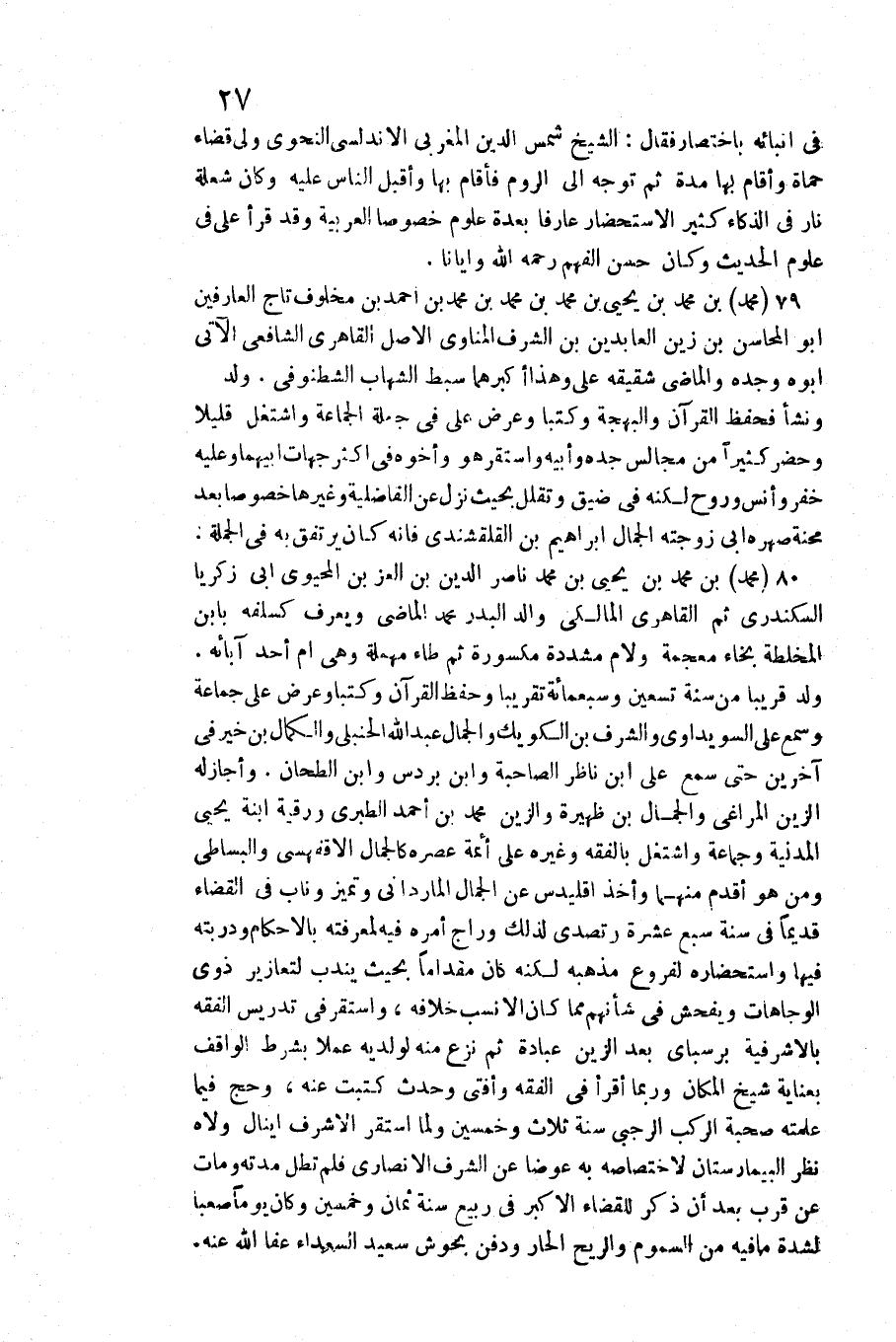 79 - مُحَمَّد بن مُحَمَّد بن يحيى بن مُحَمَّد بن مُحَمَّد بن مُحَمَّد بن أَحْمد بن مخلوف تَاج العارفين أَبُو المحاسن بن زين العابدين بن الشّرف الْمَنَاوِيّ الأَصْل القاهري الشَّافِعِي الْآتِي أَبوهُ وجده والماضي شقيقه عَليّ وَهَذَا أكبرهما سبط الشهَاب الشطنوفي. / ولد وَنَشَأ فحفظ الْقُرْآن والبهجة وكتبا وَعرض عَليّ فِي جملَة الْجَمَاعَة واشتغل قَلِيلا وَحضر كثيرا من مجَالِس جده وَأَبِيهِ وَاسْتقر هُوَ وَأَخُوهُ فِي أَكثر جِهَات أَبِيهِمَا وَعَلِيهِ خفر وَأنس وروح لكنه فِي ضيق وتقلل بِحَيْثُ نزل عَن الْفَاضِلِيَّةِ وَغَيرهَا خُصُوصا بعد محنة صهره أبي زَوجته الْجمال إِبْرَاهِيم بن القلقشندي فَإِنَّهُ كَانَ يرتفق فِي الْجُمْلَة.