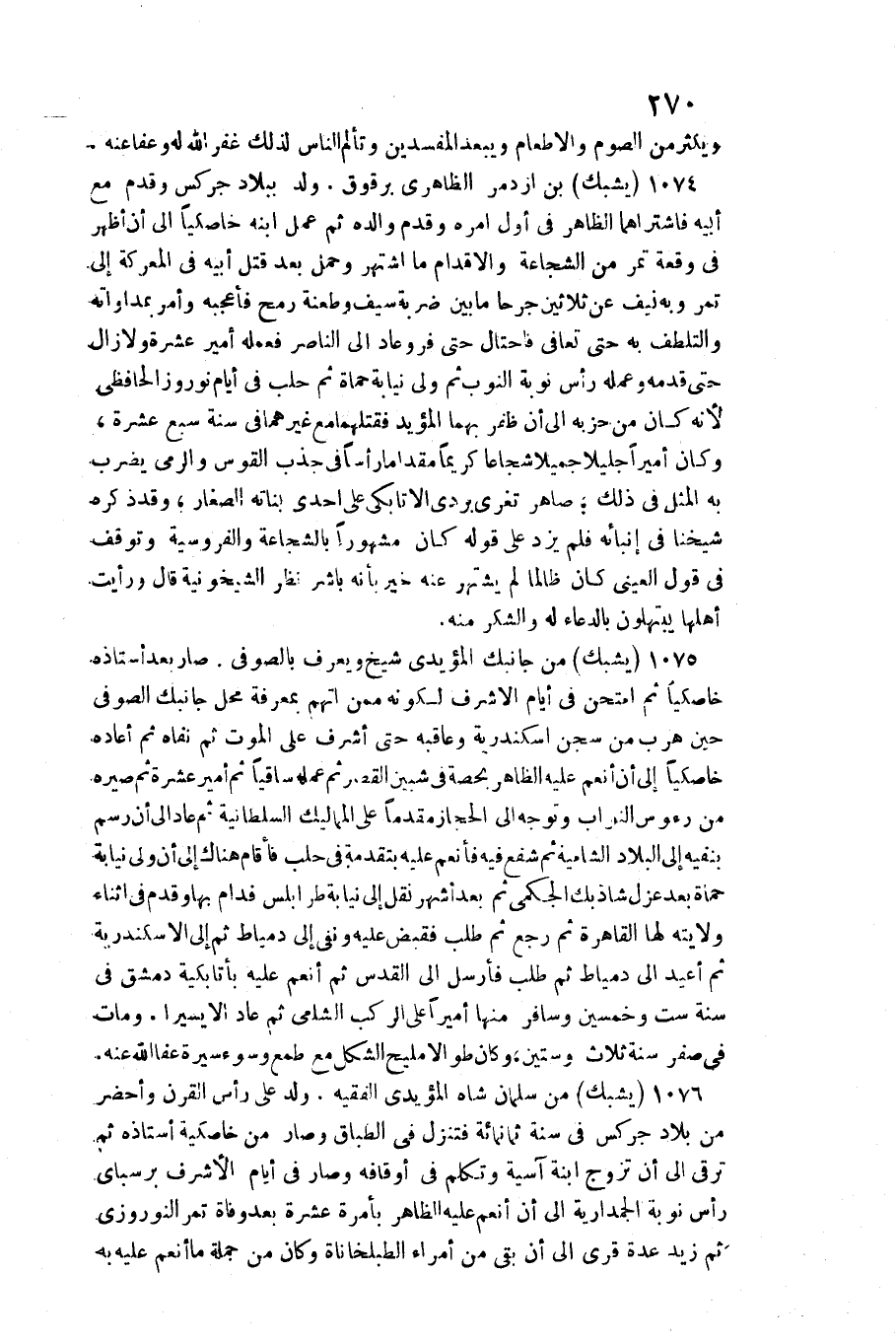 1075 - يشبك من جَانِبك المؤيدي شيخ وَيعرف بالصوفي. / صَار بعد أستاذه خاصكيا ثمَّ امتحن فِي أَيَّام الْأَشْرَف لكَونه مِمَّن اتهمَ بِمَعْرِِفَة مَحل جَانِبك الصُّوفِي حِين هرب من سجن إسكندرية وعاقبه حَتَّى أشرف على الْمَوْت ثمَّ نَفَاهُ ثمَّ أَعَادَهُ خاصكيا إِلَى أَن أنعم عَلَيْهِ الظَّاهِر بِحِصَّة فِي شبين الْقصر ثمَّ عمله ساقيا ثمَّ أَمِير عشرَة ثمَّ صيره من رُءُوس النواب وَتوجه إِلَى)