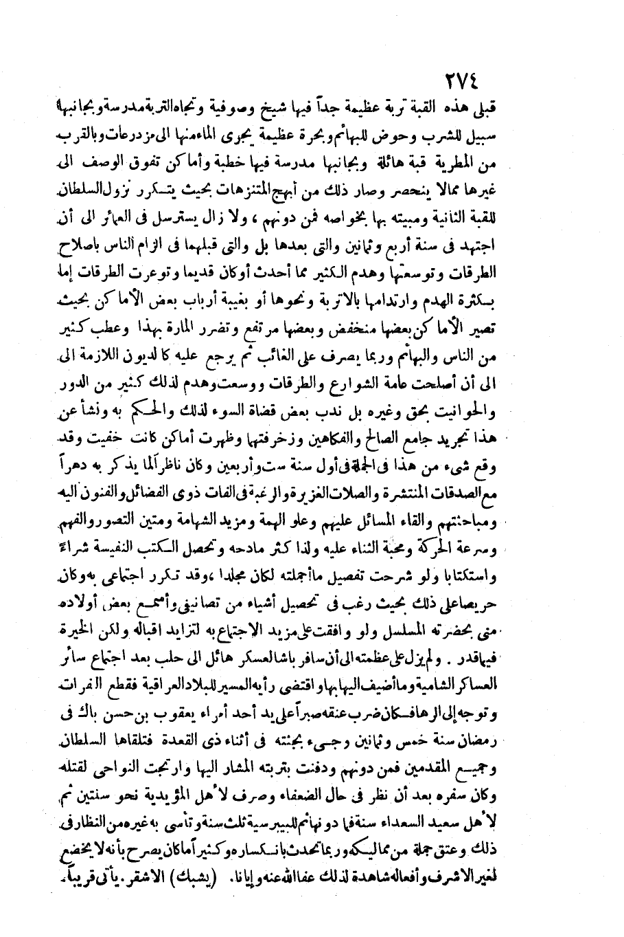 قبلي هَذِه الْقبَّة تربة عَظِيمَة جدا فِيهَا شيخ وصوفية وتجاه التربة مدرسة وبجانبها سَبِيل للشُّرْب وحوض للبهائم وبحرة عَظِيمَة يجْرِي المَاء مِنْهَا إِلَى مزروعات وبالقرب من المطرية قبَّة هائلة وبجانبها مدرسة فِيهَا خطْبَة وأماكن تفوق الْوَصْف إِلَى غَيرهَا مِمَّا لَا ينْحَصر وَصَارَ ذَلِك من أبهج المتنزهات بِحَيْثُ يتَكَرَّر نزُول اللسطان للقبة الثَّانِيَة ومبيته بهَا بخواصه فَمن دونهم، وَلَا زَالَ يسترسل فِي العمائر إِلَى أَن اجْتهد فِي سنة أَربع وَثَمَانِينَ وَالَّتِي بعْدهَا بل وَالَّتِي قبلهمَا فِي إِلْزَام النَّاس بإصلاح الطرقات وتوسعتها وَهدم الْكثير مِمَّا أحدث أَو كَانَ قَدِيما وتوعرت الطرقات إِمَّا بِكَثْرَة الْهدم وارتدامها بالأتربة وَنَحْوهَا أَو بغيبة أَرْبَاب بعض الْأَمَاكِن بِحَيْثُ تصير الْأَمَاكِن بَعْضهَا منخفض وَبَعضهَا مُرْتَفع وتضرر الْمَارَّة بِهَذَا وعطب كثير من النَّاس والبهائم وَرُبمَا يصرف على الْغَائِب ثمَّ يرجع عَلَيْهِ كالديون اللَّازِمَة إِلَى أَن أصلحت عَامَّة الشوارع والطرقات ووسعت وَهدم لذَلِك كثير من الدّور والحوانيت بِحَق وَغَيره بل ندب بعض قُضَاة السوء لذَلِك وَالْحكم بِهِ وَنَشَأ عَن هَذَا تَجْرِيد جَامع الصَّالح والفكاهين وزخرفتهما وَظَهَرت أَمَاكِن كَانَت خفيت وَقد وَقع شَيْء من هَذَا فِي الْجُمْلَة أول سنة سِتّ وَأَرْبَعين وَكَانَ)
