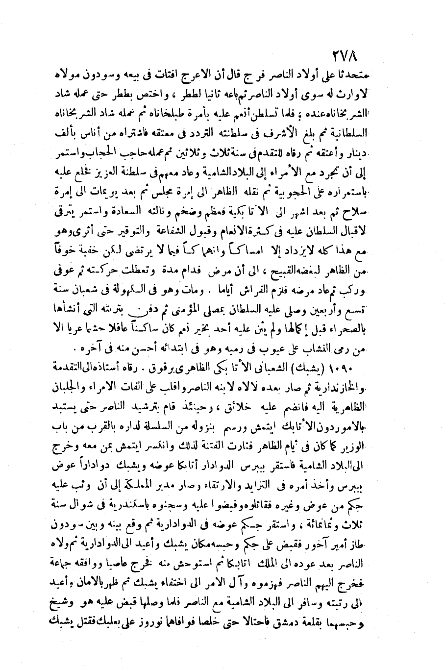 1090 - يشبك الشَّعْبَانِي الأتابكي الظَّاهِرِيّ برقوق. / رقاه أستاذه إِلَى التقدمة والخازندارية ثمَّ صَار بعده لالاه لِابْنِهِ النَّاصِر واقلب على الفات الْأُمَرَاء والجلبان الظَّاهِرِيَّة إِلَيْهِ فانضم عَلَيْهِ خلائق، وَحِينَئِذٍ قَامَ بترشيد النَّاصِر حَتَّى يستبد بالأمور دون الأتابك أيتمش ورسم بنزوله من السلسلة لداره بِالْقربِ من بَاب الْوَزير كَمَا كَانَ فِي أَيَّام الظَّاهِر فثارت الْفِتْنَة لذَلِك وانكسر أيتمش بِمن مَعَه وَخرج إِلَى الْبِلَاد الشامية فاستقر بيبرس الدوادار أتابكا عوضه ويشبك دوادارا عوض بيبرس وَأخذ أمره فِي التزايد والارتقاء وَصَارَ مُدبر المملكة إِلَى أَن وثب عَلَيْهِ جكم من عوض وَغَيره فقاتلوه وقبضوا عَلَيْهِ وسجنوه بإسكندرية فِي شَوَّال سنة ثَلَاث وَثَمَانمِائَة، وَاسْتقر جكم عوضه فِي الدوادارية ثمَّ وَقع بَينه وَبَين سودون طاز أَمِير آخور فَقبض على جكم وحبسه مَكَان يشبك وأعيد إِلَى الدوادارية ثمَّ ولاه النَّاصِر بعد عوده إِلَى الْملك أتابكا ثمَّ استوحش مِنْهُ فَخرج عَاصِيا وَوَافَقَهُ جمَاعَة فَخرج إِلَيْهِم النَّاصِر فهزموه وَآل الْأَمر إِلَى اختفاء يشبك ثمَّ ظهر بالأمان وأعيد إِلَى رتبته وسافر إِلَى الْبِلَاد الشامية مَعَ النَّاصِر فَلَمَّا وَصلهَا قبض عَلَيْهِ هُوَ وَشَيخ وحبسهما بقلعة دمشق فاحتالا حَتَّى خلصا فوافاهما نوروز على بلعبلك فَقتل يشبك