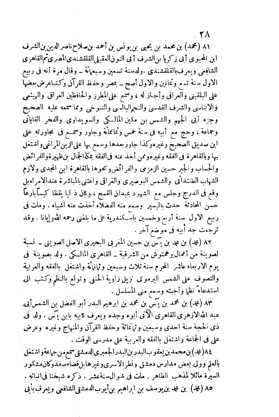 83 - مُحَمَّد بن مُحَمَّد بن يس بن مُحَمَّد بن إِبْرَهِيمُ الْبَدْر أَبُو الْفضل بن الشَّمْس أبي عبد الله الْأَزْهَرِي القاهري الْآتِي أَبوهُ وجده وَيعرف كأبيه بَان يس. ولد فِي ذِي الْحجَّة سنة إِحْدَى وَسبعين وَثَمَانمِائَة وَحفظ الْقُرْآن والمنهاج وَغَيره وَعرض عَليّ فِي الْجَمَاعَة واشتغل بالفقه والعربية على مدرسي الْوَقْت.