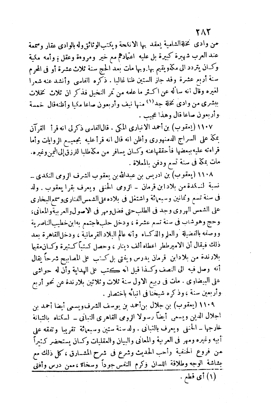 1108 - يَعْقُوب بن إِدْرِيس بن عبد الله بن يَعْقُوب الشّرف الرُّومِي النكدي نِسْبَة لنكدة من بِلَاد ابْن قرمان الرُّومِي الْحَنَفِيّ وَيعرف بقرًا يَعْقُوب. / ولد فِي سنة تسع وَثَمَانِينَ وَسَبْعمائة واشتغل فِي بِلَاده على الشَّمْس الفناري وَسمع البُخَارِيّ على الشَّمْس الْهَرَوِيّ وجد فِي الطّلب حَتَّى فضل وَمهر فِي الْأُصُول والعربية والمعاني، وَحج وَهُوَ شَاب فِي سنة تسع عشرَة، وَدخل حلب فَاجْتمع بِهِ ابْن خطيب الناصرية وَوَصفه بالفضيلة وَالْعلم والذكاء وَأَنه عَالم الْبِلَاد القرمانية، وَدخل الْقَاهِرَة بعد ذَلِك فَيُقَال أَن الْأَمِير ططر أعطَاهُ ألف دِينَار، وَحصل كتبا كَثِيرَة وَكَانَ مُقيما بلارندة من بِلَاد ابْن قرمان يدرس ويفتي بل كتب على المصابيح شرحا يُقَال أَنه وصل فِيهِ إِلَى النّصْف وَكَذَا قيل أَنه كتب على الْهِدَايَة وَأَن لَهُ حَوَاشِي على الْبَيْضَاوِيّ. مَاتَ فِي ربيع الأول سنة ثَلَاث وَثَلَاثِينَ بلارندة عَن نَحْو أَربع وَأَرْبَعين سنة، وَذكره شَيخنَا فِي إنبائه بِاخْتِصَار.