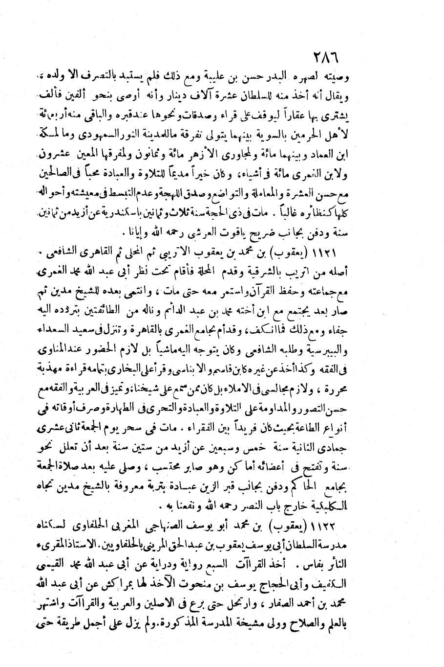 1122 - يَعْقُوب بن مُحَمَّد أَبُو يُوسُف الصنهاجي المغربي الحلفاوي / لسكناه مدرسة السُّلْطَان أبي يُوسُف بن عبد الْحق المريني بالحلفاويين. الْأُسْتَاذ الْمُقْرِئ الثائر بفاس. أَخذ القراآت السَّبع رِوَايَة ودراية عَن أبي عبد الله مُحَمَّد الْقَيْسِي الكفيف وَأبي الْحجَّاج يُوسُف بن منحوت الْآخِذ لَهَا بمراكش عَن أبي عبد الله مُحَمَّد بن أَحْمد الصفار، وارتحل حَتَّى برع فِي الْأَصْلَيْنِ والعربية والقراآت واشتهر بِالْعلمِ وَالصَّلَاح وَولي مشيخة الْمدرسَة الْمَذْكُورَة. وَلم يزل على أجمل طَريقَة حَتَّى