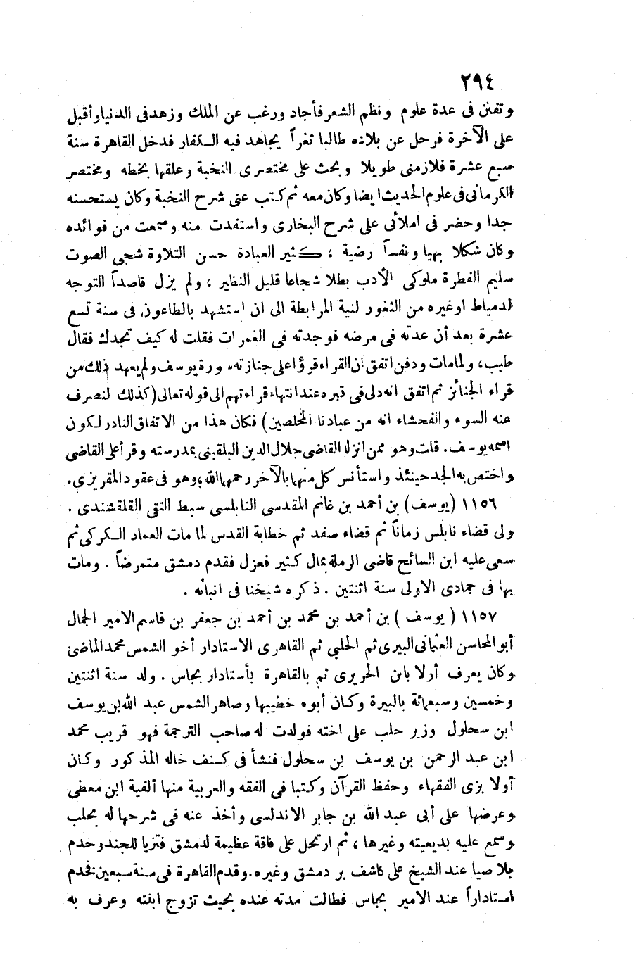 1157 - يُوسُف بن أَحْمد بن مُحَمَّد بن أَحْمد بن جَعْفَر بن قَاسم الْأَمِير الْجمال أَبُو المحاسن العثماني البيري ثمَّ الْحلَبِي ثمَّ القاهري الأستادار أَخُو الشَّمْس مُحَمَّد الْمَاضِي وَكَانَ يعرف أَولا بِابْن الحريري ثمَّ بِالْقَاهِرَةِ بأستادار بجاس. / ولد سنة اثْنَتَيْنِ وَخمسين وَسَبْعمائة بالبيرة وَكَانَ أَبوهُ خطيبها وصاهر الشَّمْس عبد الله بن يُوسُف بن سحلول وَزِير حلب على أُخْته فَولدت لَهُ صَاحب التَّرْجَمَة فَهُوَ قريب مُحَمَّد بن عبد الرَّحْمَن بن يُوسُف بن سحلول فَنَشَأَ فِي كنف خَاله الْمَذْكُور وَكَانَ أَولا بزِي الْفُقَهَاء وَحفظ الْقُرْآن وكتبا فِي الْفِقْه والعربية مِنْهَا ألفية ابْن معطي وعرضها على أبي عبد الله بن جَابر الأندلسي وَأخذ عَنهُ فِي شرحها لَهُ بحلب وَسمع عَلَيْهِ بديعيته وَغَيرهَا، ثمَّ ارتحل على فاقة عَظِيمَة لدمشق فتزيا للجند وخدم بلاصيا عِنْد الشَّيْخ عَليّ كاشف بر دمشق وَغَيره. وَقدم الْقَاهِرَة فِي سنة سبعين فخدم أستادارا عِنْد الْأَمِير بجاس فطالت مدَّته عِنْده بِحَيْثُ تزوج ابْنَته وَعرف بِهِ