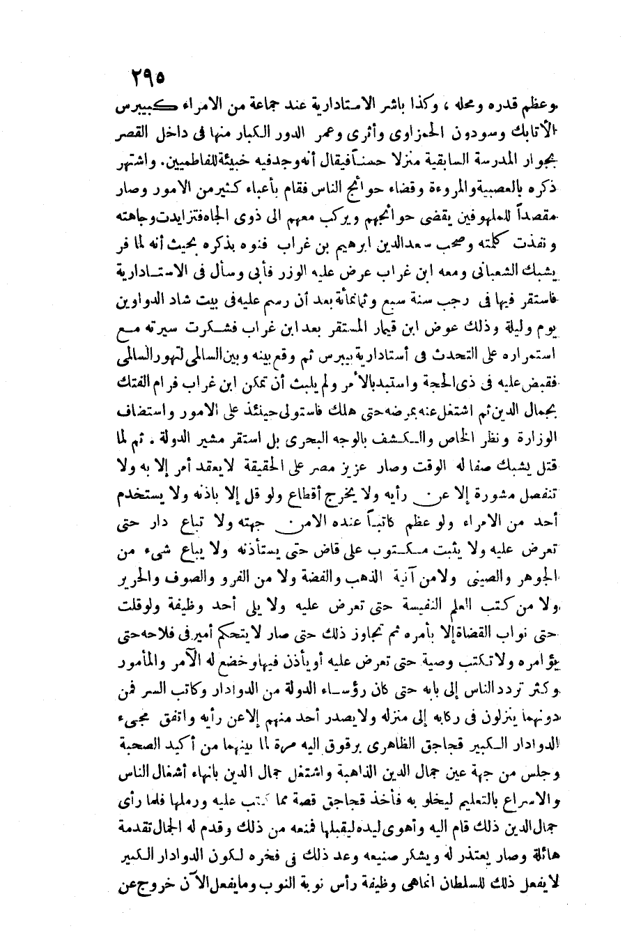 غراب عرض عَلَيْهِ الْوزر فَأبى وَسَأَلَ فِي الأستادارية فاستقر فِيهَا فِي رَجَب سنة سبع وَثَمَانمِائَة بعد أَن رسم عَلَيْهِ فِي بَيت شاد الدَّوَاوِين يَوْم وَلَيْلَة وَذَلِكَ عوض ابْن قيمار المستقر بعد ابْن غراب فَشَكَرت سيرته مَعَ استمراره على التحدث فِي أستادارية بيبرس ثمَّ وَقع بَينه وَبَين السالمي لتهور السالمي فَقبض عَلَيْهِ فِي ذِي الْحجَّة واستبد بِالْأَمر وَلم يلبث أَن تمكن ابْن غراب فرام الفتك بِجَمَال الدّين ثمَّ اشْتغل عَنهُ بمرضه حَتَّى هلك فاستولى حِينَئِذٍ على الْأُمُور واستضاف الوزارة وَنظر الْخَاص والكشف بِالْوَجْهِ البحري بل اسْتَقر مشير الدولة. ثمَّ لماقتل يشبك صفا لَهُ الْوَقْت وَصَارَ عَزِيز مصر على الْحَقِيقَة لَا يعْقد أَمر إِلَّا بِهِ وَلَا تنفصل مشورة إِلَّا عَن رَأْيه وَلَا يخرج أقطاع وَلَو قل إِلَّا بِإِذْنِهِ وَلَا يستخدم أحد من الْأُمَرَاء وَلَو عظم كَاتبا عِنْده إِلَّا من جِهَته وَلَا تبَاع دَار حَتَّى تعرض عَلَيْهِ وَلَا يثبت مَكْتُوب على قَاض حَتَّى يَسْتَأْذِنهُ وَلَا يُبَاع شَيْء من الْجَوْهَر والصيني وَلَا من آنِية الذَّهَب وَالْفِضَّة وَلَا من الفرو وَالصُّوف وَالْحَرِير وَلَا من كتب الْعلم النفيسة حَتَّى تعرض عَلَيْهِ وَلَا يَلِي أحد وَظِيفَة وَلَو قلت حَتَّى نواب الْقُضَاة إِلَّا بأَمْره ثمَّ تجَاوز ذَلِك حَتَّى صَار لَا يتحكم أَمِير فِي فلاحه حَتَّى يؤامره وَلَا تكْتب وَصِيَّة حَتَّى تعرض عَلَيْهِ أَو يَأْذَن فِيهَا وخضع لَهُ الْآمِر والمأمور وَكثر تردد النَّاس إِلَى بَابه حَتَّى كَانَ رُؤَسَاء الدولة من الدوادار وَكَاتب السِّرّ فَمن دونهمَا ينزلون فِي ركابه إِلَى منزله وَلَا يصدر أحد مِنْهُم إِلَّا عَن رَأْيه وَاتفقَ مَجِيء الدوادار الْكَبِير قجاجق الظَّاهِرِيّ برقوق إِلَيْهِ مرّة لما بَينهمَا من أكيد الصُّحْبَة وَجلسَ من جِهَة عين جمال الدّين الذاهبة واشتغل جمال الدّين بإنهاء أشغال النَّاس والإسراع بالتعليم ليخلو بِهِ فَأخذ قجاجق قصَّة مِمَّا كتب عَلَيْهِ ورملها فَلَمَّا رأى جمال الدّين ذَلِك قَامَ إِلَيْهِ وأهوى ليده ليقبلها فَمَنعه من ذَلِك وَقدم لَهُ الْجمال تقدمة هائلة وَصَارَ يعْتَذر لَهُ ويشكر صَنِيعه وعد ذَلِك فِي فخره لكَون الدوادار الْكَبِير لَا يفعل ذَلِك للسُّلْطَان إِنَّمَا هِيَ وَظِيفَة رَأس نوبَة النوب وَمَا يفعل الْآن خُرُوج عَن