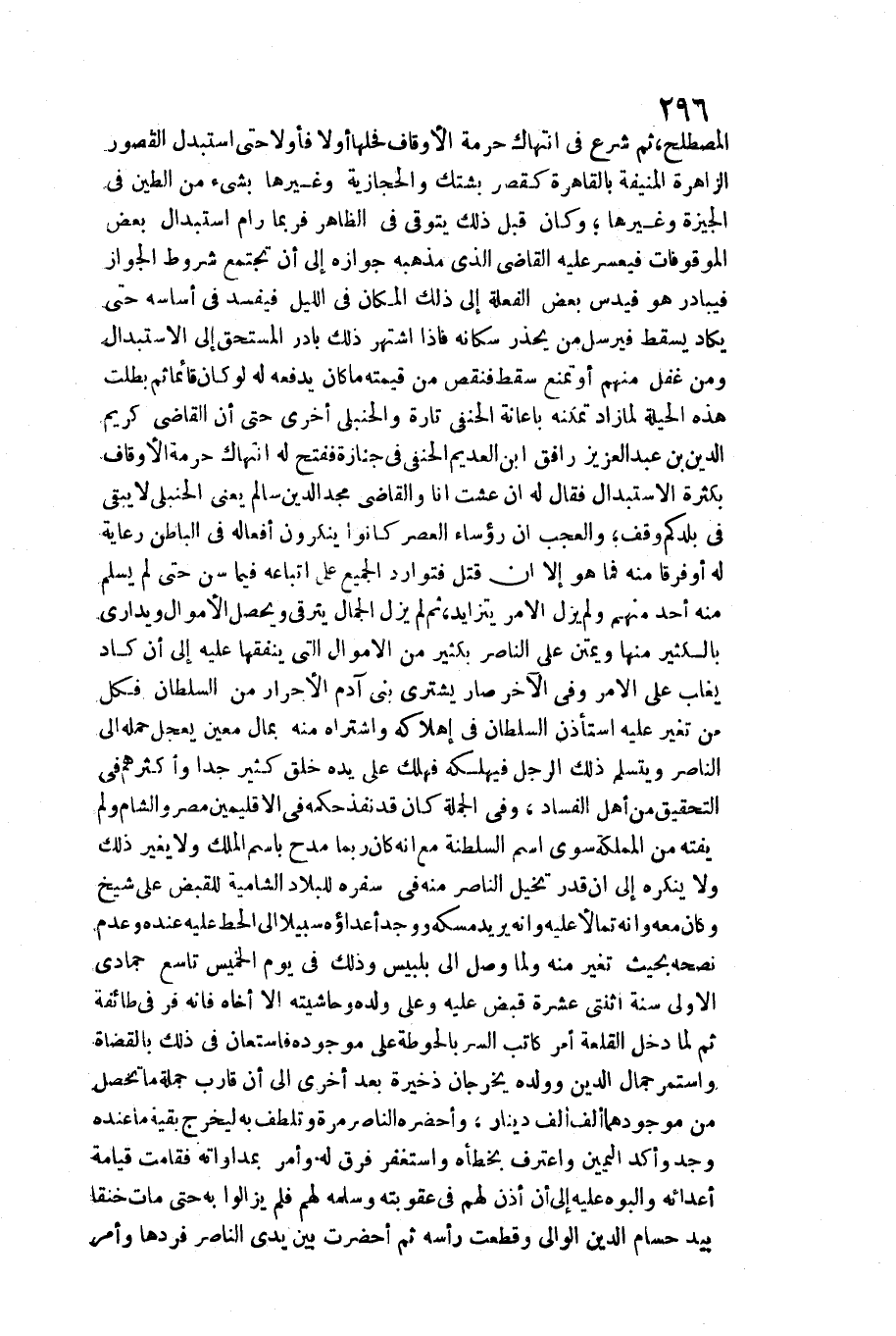 مِنْهُم أَو تمنع سقط فنقص من قِيمَته مَا كَانَ يَدْفَعهُ لَهُ لَو كَانَ قَائِما ثمَّ بطلت هَذِه الْحِيلَة لما زَاد تمكنه بإعانة الْحَنَفِيّ تَارَة والحنبلي أُخْرَى حَتَّى أَن القَاضِي كريم الدّين بن عبد الْعَزِيز رافق ابْن العديم الْحَنَفِيّ فِي جَنَازَة فَفتح لَهُ انتهاك حُرْمَة الْأَوْقَاف بِكَثْرَة الِاسْتِبْدَال فَقَالَ لَهُ إِن عِشْت أَنا وَالْقَاضِي مجد الدّين سَالم يَعْنِي الْحَنْبَلِيّ لَا يبْقى فِي بلدكم وقف وَالْعجب أَن رُؤَسَاء الْعَصْر كَانُوا يُنكرُونَ أَفعاله فِي الْبَاطِن رِعَايَة لَهُ أَو فرقا مِنْهُ فَمَا هُوَ إِلَّا أَن قتل فتوارد الْجَمِيع على اتِّبَاعه فِيمَا سنّ حَتَّى لم يسلم مِنْهُ أحد مِنْهُم وَلم يزل الْأَمر يتزايد، ثمَّ لم يزل الْجمال يترقى وَيحصل الْأَمْوَال ويداري بالكثير مِنْهَا ويمتن على النَّاصِر بِكَثِير من الْأَمْوَال الَّتِي ينفقها عَلَيْهِ إِلَى أَن كَاد يغلب على الْأَمر وَفِي الآخر صَار يَشْتَرِي بني آدم الْأَحْرَار من السُّلْطَان فَكل من تغير عَلَيْهِ اسْتَأْذن السُّلْطَان فِي إهلاكه وَاشْتَرَاهُ مِنْهُ بِمَال معِين يعجل حمله إِلَى النَّاصِر ويتسلم ذَلِك الرجل فيهلكه فَهَلَك على يَده خلق كثير جدا وَأَكْثَرهم فِي التَّحْقِيق من أهل الْفساد، وَفِي الْجُمْلَة كَانَ قد نفذ حكمه فِي الإقليمين مصر وَالشَّام وَلم يفته من المملكة سوى اسْم السلطنة مَعَ أَنه كَانَ رُبمَا مدح باسم الْملك وَلَا يُغير ذَلِك وَلَا يُنكره إِلَى أَن قدر تخيل النَّاصِر مِنْهُ فِي سَفَره للبلاد الشامية للقبض على شيخ وَكَانَ مَعَه وَإنَّهُ تمالأ عَلَيْهِ وَإنَّهُ يُرِيد مسكه وَوجد أعداؤه سَبِيلا إِلَى الْحَط عَلَيْهِ عِنْده وَعدم نصحه بِحَيْثُ تغير مِنْهُ وَلما وصل إِلَى بلبيس وَذَلِكَ فِي يَوْم الْخَمِيس تَاسِع جُمَادَى الأولى سنة اثْنَتَيْ عشرَة قبض عَلَيْهِ وعَلى وَلَده وحاشيته إِلَّا أَخَاهُ فَإِنَّهُ فر فِي طَائِفَة ثمَّ لما دخل القلعة أَمر كَاتب السِّرّ بالحوطة على موجوده فاستعان فِي ذَلِك بالقضاة وَاسْتمرّ جمال الدّين وَولده يخرجَانِ ذخيرة بعد أُخْرَى إِلَى أَن قَارب جملَة مَا تحصل من موجودهما ألف ألف دِينَار، وأحضره النَّاصِر مرّة وتلطف بِهِ ليخرج بَقِيَّة مَا عِنْده وجد وأكد الْيَمين واعترف بخطأه واستغفر فرق لَهُ وَأمر بمداواته فَقَامَتْ قِيَامَة أعدائه وألبوه عَلَيْهِ إِلَى أَن أذن لَهُم فِي عُقُوبَته وَسلمهُ لَهُم فَلم يزَالُوا بِهِ حَتَّى مَاتَ خنقا بيد حسام الدّين الْوَالِي وَقطعت رَأسه ثمَّ أحضرت بَين يَدي النَّاصِر فَردهَا وَأمر