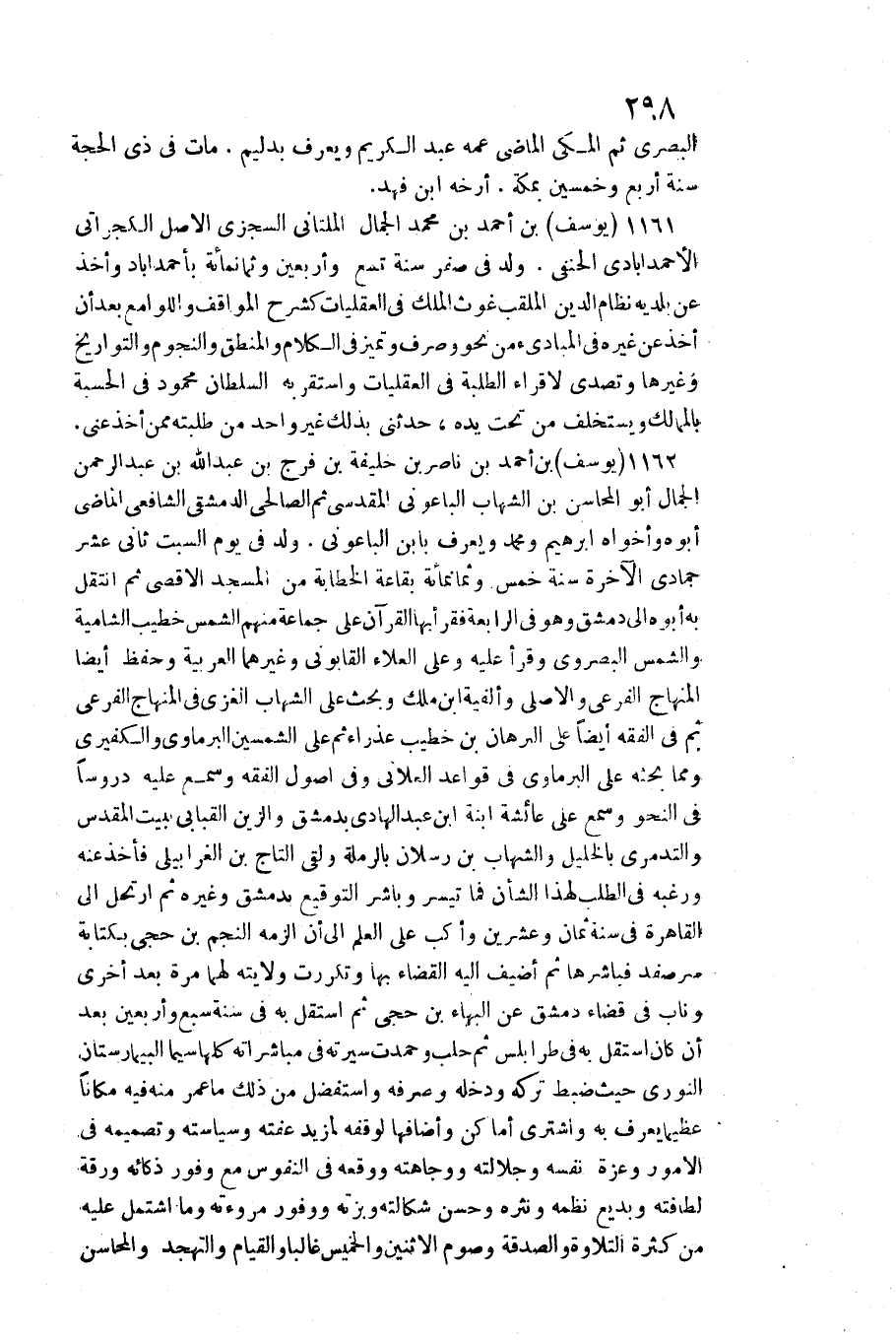 1162 - يُوسُف بن أَحْمد بن نَاصِر بن خَليفَة بن فرج بن عبد الله بن عبد الرَّحْمَن الْجمال أَبُو المحاسن بن الشهَاب الباعوني الْمَقْدِسِي ثمَّ الصَّالِحِي الدِّمَشْقِي الشَّافِعِي الْمَاضِي أَبوهُ وَأَخُوهُ إِبْرَهِيمُ وَمُحَمّد وَيعرف بِابْن الباعوني. / ولد فِي يَوْم السبت ثَانِي عشر جُمَادَى الْآخِرَة سنة خمس وَثَمَانمِائَة بقاعة الخطابة من الْمَسْجِد الْأَقْصَى ثمَّ انْتقل بِهِ أَبوهُ إِلَى دمشق وَهُوَ فِي الرَّابِعَة فَقَرَأَ بهَا الْقُرْآن على جمَاعَة مِنْهُم الشَّمْس خطيب الشامية وَالشَّمْس البصروي وَقَرَأَ عَلَيْهِ وعَلى الْعَلَاء القابوني وَغَيرهمَا الْعَرَبيَّة وَحفظ أَيْضا الْمنْهَج الفرعي والأصلي وألفية ابْن ملك وَبحث على الشهَاب الْغَزِّي فِي الْمِنْهَاج الفرعي ثمَّ فِي الْفِقْه أَيْضا على الْبُرْهَان بن خطيب عذراء ثمَّ على الشمسين الْبرمَاوِيّ والكفيري وَمِمَّا بَحثه على الْبرمَاوِيّ فِي قَوَاعِد العلاني وَفِي أصُول الْفِقْه وَسمع عَلَيْهِ دروسا فِي النَّحْو وَسمع على عَائِشَة ابْنة ابْن عبد الْهَادِي بِدِمَشْق والزين القبابي بِبَيْت الْمُقَدّس والتدمري بالخليل والشهاب بن رسْلَان بالرملة وَلَقي التَّاج بن الغرابيلي فَأخذ عَنهُ ورغبه فِي الطّلب لهَذَا الشَّأْن فَمَا تيَسّر وباشر التوقيع بِدِمَشْق وَغَيره ثمَّ ارتحل إِلَى الْقَاهِرَة فِي سنة ثَمَان وَعشْرين وأكب على الْعلم إِلَى أَن ألزمهُ النَّجْم بن حجي بِكِتَابَة سر صفد فباشرها ثمَّ أضيف إِلَيْهِ الْقَضَاء بهَا وتكررت ولَايَته لَهما مرّة بعد أُخْرَى وناب فِي قَضَاء دمشق عَن الْبَهَاء بن حجي ثمَّ اسْتَقل بِهِ فِي سنة سبع وَأَرْبَعين بعد أَن كَانَ اسْتَقل بِهِ فِي طرابلس ثمَّ حلب وحمدت سيرته فِي مباشراته كلهَا سِيمَا البيمارستان النوري حَيْثُ ضبط تَركه ودخله وَصَرفه واستفضل من ذَلِك مَا عمر مِنْهُ فِيهِ مَكَانا عَظِيما يعرف بِهِ وَاشْترى أَمَاكِن وأضافها لوقفه لمزيد عفته وسياسته وتصميمه فِي الْأُمُور وَعزة نَفسه وجلالته ووجاهته ووقعه فِي النُّفُوس مَعَ وفور ذكائه ورقة لطافته وبديع نظمه ونثره وَحسن شكالته وبزته ووفور مروءته وَمَا اشْتَمَل عَلَيْهِ من كَثْرَة التِّلَاوَة وَالصَّدَََقَة وَصَوْم الِاثْنَيْنِ وَالْخَمِيس غَالِبا وَالْقِيَام)