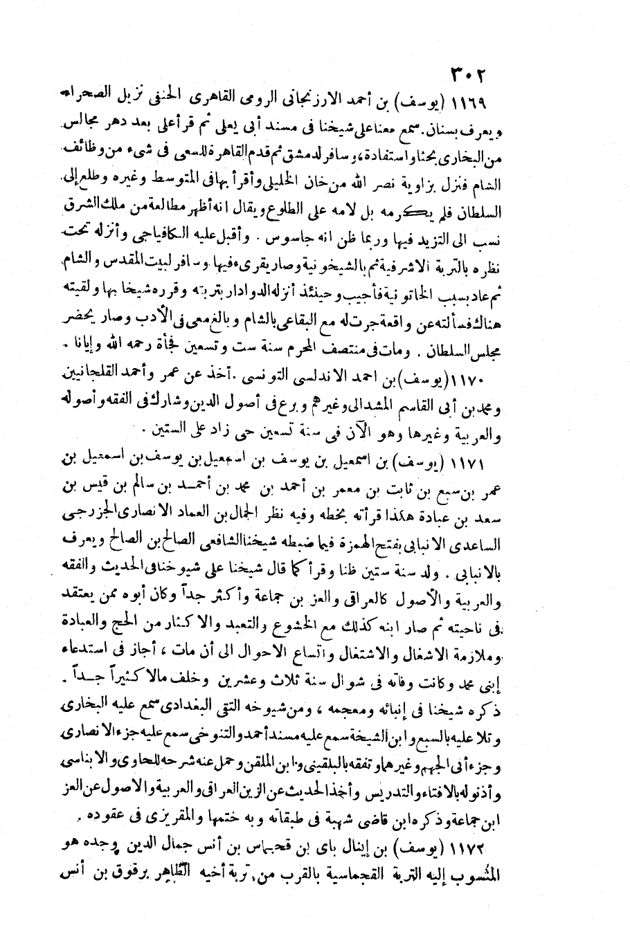 1169 - يُوسُف بن أَحْمد الأرزنجاني الرُّومِي القاهري الْحَنَفِيّ نزيل الصَّحرَاء وَيعرف بسنان / سمع مَعنا على شَيخنَا فِي مُسْند أبي يعلى ثمَّ قَرَأَ عَليّ بعد دهر مجَالِس من البُخَارِيّ بحثا واستفادة، وسافر لدمشق ثمَّ قدم الْقَاهِرَة للسعي فِي شَيْء من وظائف الشَّام فَنزل بزاوية نصر الله من خَان الخليلي وأقرأ بهَا فِي الْمُتَوَسّط وَغَيره وطلع إِلَى السُّلْطَان فَلم يُكرمهُ بل لامه على الطُّلُوع وَيُقَال أَنه أظهر مطالعة من ملك الشرق نسب إِلَى التزيد فِيهَا وَرُبمَا ظن أَنه جاسوس.