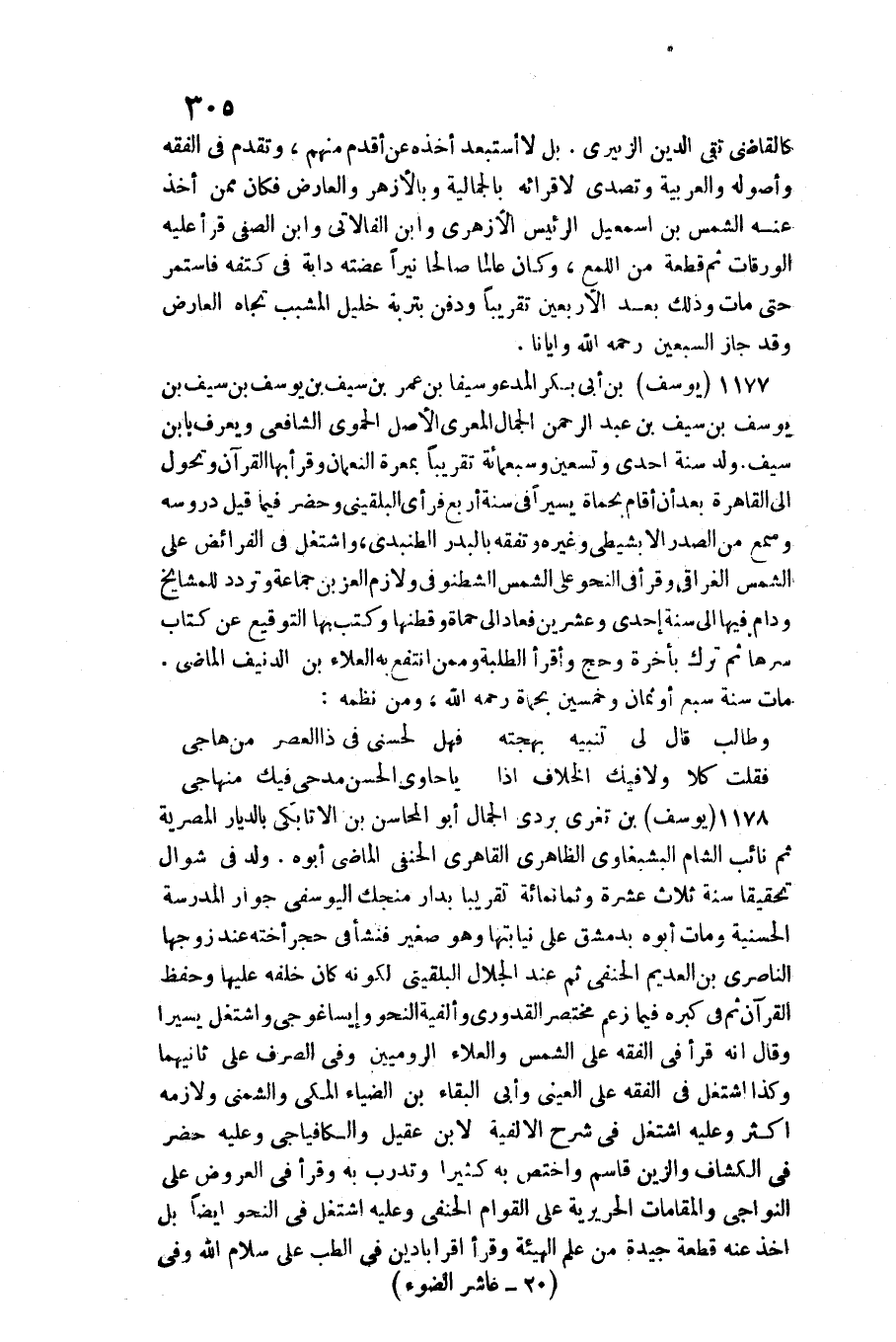 1178 - يُوسُف بن تغرى بردى الْجمال أَبُو المحاسن بن الأتابكي بالديار المصرية ثمَّ نَائِب الشَّام البشبغاوي الظَّاهِرِيّ القاهري الْحَنَفِيّ / الْمَاضِي أَبوهُ. ولد فِي شَوَّال تَحْقِيقا سنة ثَلَاث عشرَة وَثَمَانمِائَة تَقْرِيبًا بدار منجك اليوسفي جوَار الْمدرسَة الحسنية وَمَات أَبوهُ بِدِمَشْق على نيابتها وَهُوَ صَغِير فَنَشَأَ فِي حجر أُخْته عِنْد زَوجهَا الناصري بن العديم الْحَنَفِيّ ثمَّ عِنْد الْجلَال البُلْقِينِيّ لكَونه كَانَ خَلفه عَلَيْهَا وَحفظ الْقُرْآن ثمَّ فِي كبره فِيمَا زعم مُخْتَصر الْقَدُورِيّ وألفية النَّحْو وإيساغوجي واشتغل يَسِيرا وَقَالَ أَنه قَرَأَ فِي الْفِقْه على الشَّمْس والْعَلَاء الروميين وَفِي الصّرْف على ثَانِيهمَا وَكَذَا اشْتغل فِي الْفِقْه على الْعَيْنِيّ وَأبي الْبَقَاء بن الضياء الْمَكِّيّ والشمني ولازمه أَكثر وَعَلِيهِ اشْتغل فِي شرح الألفية لِابْنِ عقيل والكافياجي وَعَلِيهِ حضر فِي الْكَشَّاف والزين قَاسم واختص بِهِ كثيرا وتدرب بِهِ وَقَرَأَ فِي الْعرُوض على النواجي والمقامات الحريرية على القوام الْحَنَفِيّ وَعَلِيهِ اشْتغل فِي النَّحْو أَيْضا بل أَخذ عَنهُ قِطْعَة جَيِّدَة من علم الْهَيْئَة وَقَرَأَ أقرابادين فِي الطِّبّ على سَلام الله وَفِي