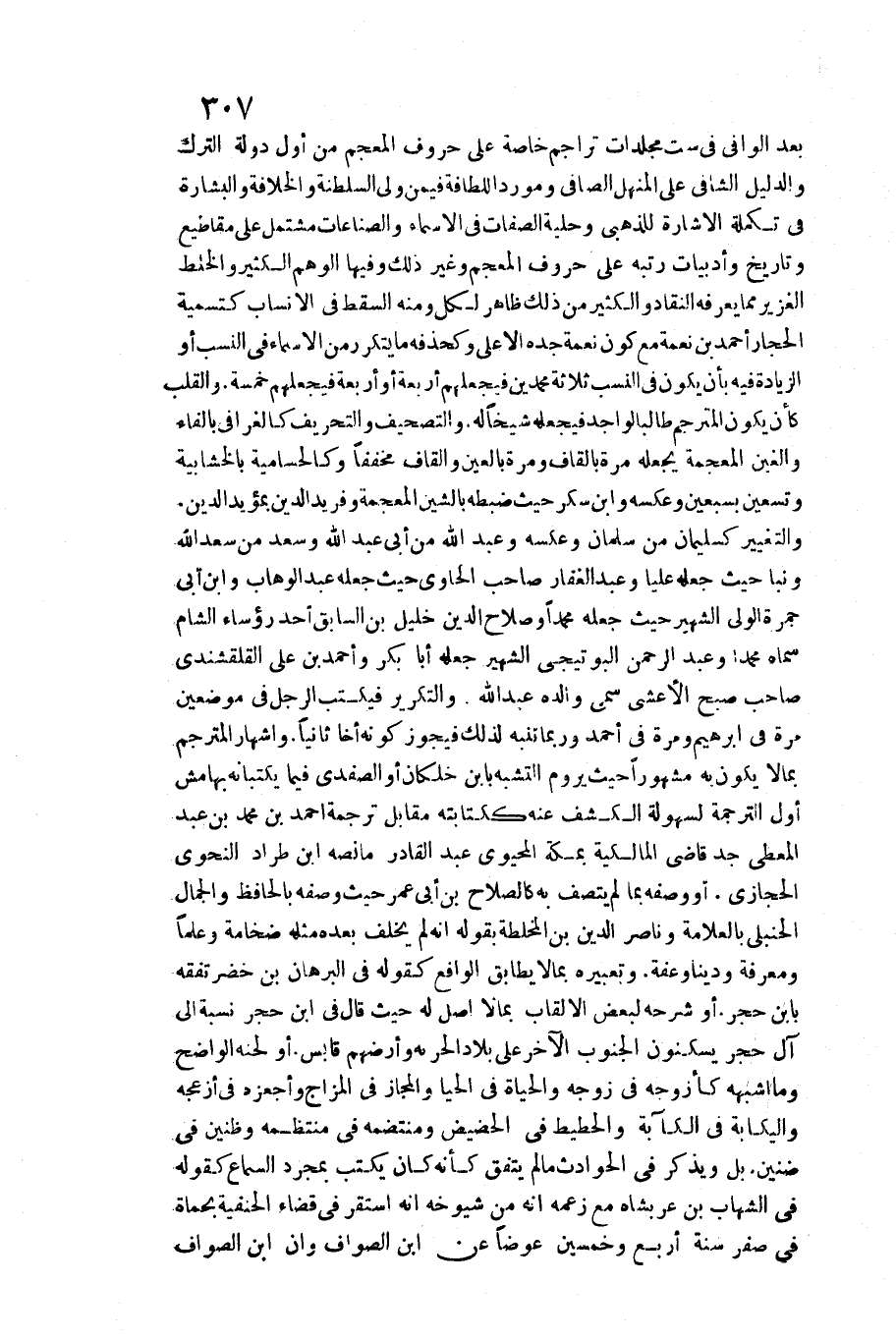 بعد الوافي فِي سِتّ مجلدات تراجم خَاصَّة على حُرُوف المعجم من أول دولة التّرْك وَالدَّلِيل الشافي على المنهل الصافي ومورد اللطافة فِيمَن ولي السلطنة والخلافة والبشارة فِي تَكْمِلَة الْإِشَارَة للذهبي وَحلية الصِّفَات فِي الْأَسْمَاء والصناعات مُشْتَمل على مقاطيع وتاريخ وأدبيات رتبه على حُرُوف المعجم وَغير ذَلِك وفيهَا الْوَهم الْكثير والخلط الغزير مِمَّا يعرفهُ النقاد وَالْكثير من ذَلِك ظَاهر لكل وَمِنْه السقط فِي الْأَنْسَاب كتسمية الحجار أَحْمد بن نعْمَة مَعَ كَون نعْمَة جده الْأَعْلَى وكحذفه مَا يتَكَرَّر من الْأَسْمَاء فِي النّسَب أَو الزِّيَادَة فِيهِ بِأَن يكون فِي النّسَب ثَلَاثَة محمدين فيجعلهم أَرْبَعَة أَو أَرْبَعَة فيجعلهم خَمْسَة. وَالْقلب كَأَن يكون المترجم طَالبا لواجد فَيَجْعَلهُ شَيخا لَهُ. والتصحيف والتحريف كالغرافي بِالْفَاءِ والغين الْمُعْجَمَة يَجعله مرّة بِالْقَافِ وَمرَّة بِالْعينِ وَالْقَاف مخففا وكالحسامية بالخشابية وَتِسْعين بسبعين وَعَكسه وَابْن سكر حَيْثُ ضَبطه بالشين الْمُعْجَمَة وفريد الدّين بمؤيد الدّين. والتغيير كسليمان من سلمَان وَعَكسه وَعبد الله من أبي عبد الله وَسعد من سعد الله ونبا حَيْثُ جعله عليا وَعبد الْغفار صَاحب الْحَاوِي حَيْثُ جعله عبد الْوَهَّاب وَابْن أبي جَمْرَة الْوَلِيّ الشهير حَيْثُ جعله مُحَمَّدًا وَصَلَاح الدّين خَلِيل بن)