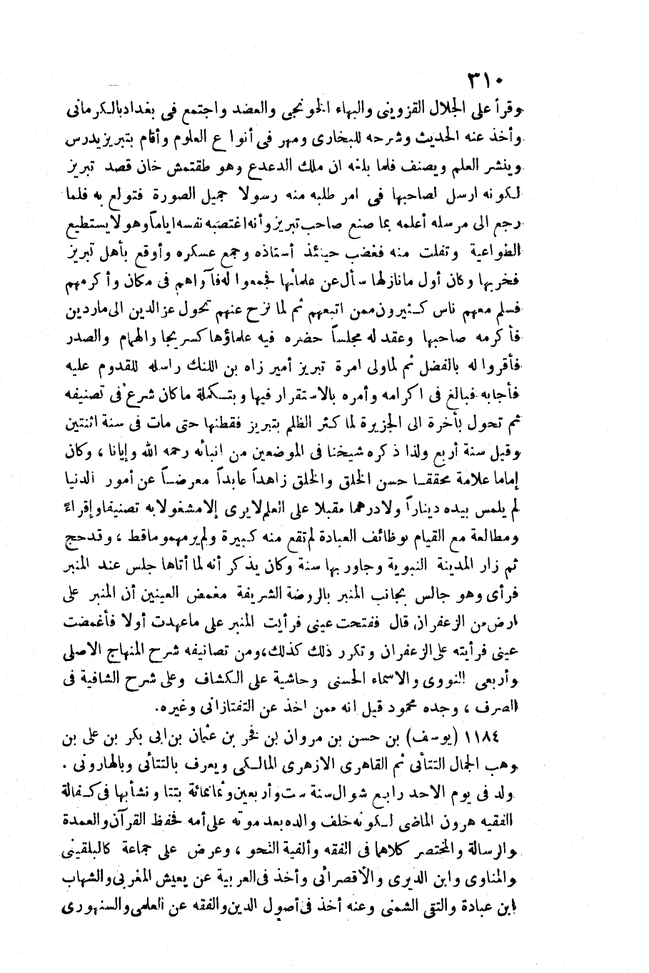 1184 - يُوسُف بن حسن بن مَرْوَان بن فَخر بن عُثْمَان بن أبي بكر بن عَليّ بن وهب الْجمال التتائي ثمَّ القاهري الْأَزْهَرِي الْمَالِكِي وَيعرف بالتتائي وبالهاروني. / ولد فِي يَوْم الْأَحَد رَابِع شَوَّال سنة سِتّ وَأَرْبَعين وَثَمَانمِائَة بتتا وَنَشَأ بهَا فِي كَفَالَة الْفَقِيه هرون الْمَاضِي لكَونه خلف وَالِده بعد مَوته على أمه فحفظ الْقُرْآن والعمدة والرسالة والمختصر كِلَاهُمَا فِي الْفِقْه وألفية النَّحْو، وَعرض على جمَاعَة كالبلقيني والمناوي وَابْن الديري والأقصرائي وَأخذ فِي الْعَرَبيَّة عَن يعِيش المغربي والشهاب ابْن عبَادَة والتقي الشمني وَعنهُ أَخذ فِي أصُول الدّين وَالْفِقْه عَن العلمي والسنهوري