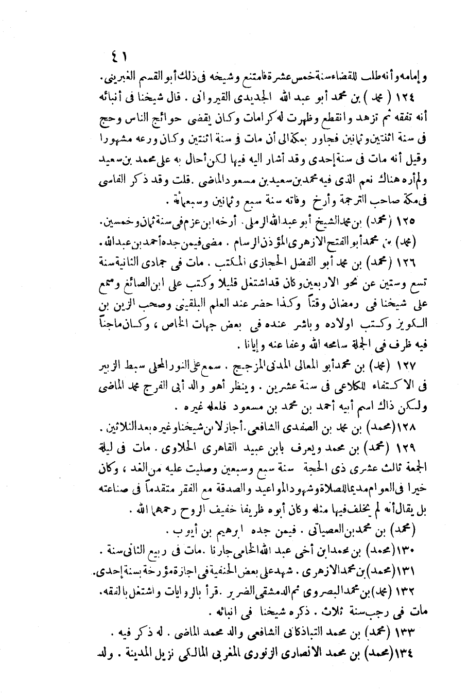 124 - مُحَمَّد بن مُحَمَّد أَبُو عبد الله الجديدي القيرواني. / قَالَ شَيخنَا فِي أنبائه أَنه تفقه ثمَّ تزهد وَانْقطع وَظَهَرت لَهُ كرامات وَكَانَ يقْضِي حوائج النَّاس وَحج فِي سنة اثْنَتَيْنِ وَثَمَانِينَ فجاور بِمَكَّة إِلَى أَن مَاتَ فِي سنة اثْنَتَيْنِ وَكَانَ ورعه مَشْهُورا وَقيل أَنه مَاتَ فِي سنة إِحْدَى وَقد أَشَارَ إِلَيْهِ فِيهَا لَكِن أحَال بِهِ على مُحَمَّد بن سعيد وَلم أره هُنَاكَ نعم الَّذِي فِيهِ مُحَمَّد بن سعيد بن مَسْعُود الْمَاضِي. قلت وَقد ذكر الفاسي فِي مَكَّة صَاحب التَّرْجَمَة وأرخ وَفَاته سنة سبع وَثَمَانِينَ وَسَبْعمائة.) (سقط)