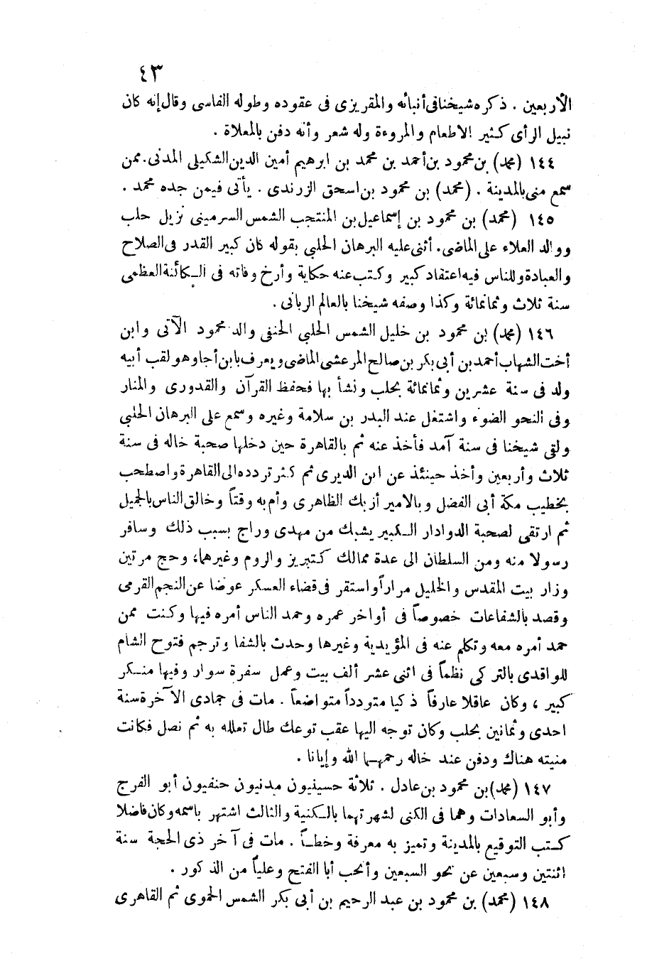147 - مُحَمَّد بن مَحْمُود بن عَادل. / ثَلَاثَة حسينيون مدنيون حنفيون أَبُو الْفرج وَأَبُو السعادات وهما فِي الكنى لشهرتهما بالكنية وَالثَّالِث اشْتهر باسمه وَكَانَ فَاضلا كتب التوقيع بِالْمَدِينَةِ وتميز بِهِ معرفَة وخطا. مَاتَ فِي آخر ذِي الْحجَّة سنة اثْنَتَيْنِ وَسبعين عَن نَحْو السّبْعين وأنجب أَبَا الْفَتْح وعليا من الذُّكُور.