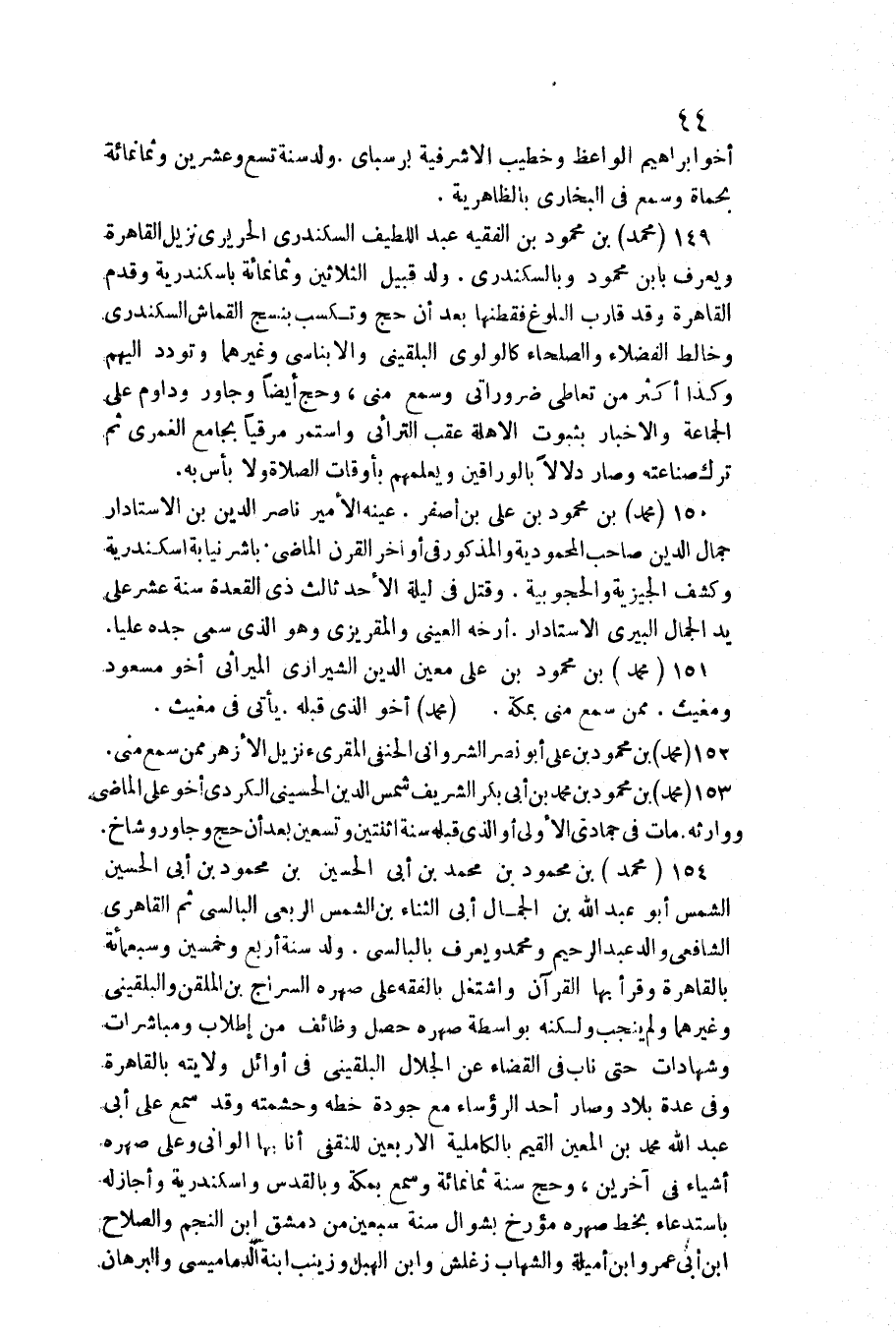 149 - مُحَمَّد بن مَحْمُود بن الْفَقِيه عبد اللَّطِيف السكندري الحريري نزيل الْقَاهِرَة وَيعرف بِابْن مَحْمُود وبالسكندري. / ولد قبيل الثَّلَاثِينَ وَثَمَانمِائَة بإسكندرية وَقدم الْقَاهِرَة وَقد قَارب الْبلُوغ فقطنها بعد أَن حج وتكسب بنسج القماش السكندري وخالط الْفُضَلَاء والصلحاء كالولوي البُلْقِينِيّ والأبناسي وَغَيرهمَا وتودد إِلَيْهِم وَكَذَا أَكثر من تعَاطِي ضروراتي وَسمع مني، وَحج أَيْضا وجاور وداوم على الْجَمَاعَة وَالْأَخْبَار بِثُبُوت الْأَهِلّة عقب الترائي وَاسْتمرّ مرقيا بِجَامِع الغمري ثمَّ ترك صناعته وَصَارَ دلالا بالوراقين وَيُعلمهُم بأوقات الصَّلَاة وَلَا بَأْس بِهِ.