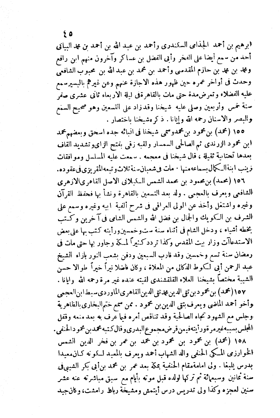 158 - مُحَمَّد بن مَحْمُود بن مَحْمُود بن مُحَمَّد بن عمر بن فَخر الدّين الشَّمْس الْخَوَارِزْمِيّ الْمَكِّيّ الْحَنَفِيّ وَالِد الشهَاب أَحْمد وَيعرف بالمعيد / لكَونه كَانَ معيدا بدرس يلبغا. ولي إِمَامَة مقَام الْحَنَفِيَّة بِمَكَّة بعد عمر بن مُحَمَّد بن أبي بكر الشيبي فِي سنة ثَمَانِينَ وَسَبْعمائة ثمَّ تَركهَا لوَلَده قبل مَوته بأيام مَعَ سبق مُبَاشَرَته عَنهُ عشر سِنِين لعَجزه وَكَذَا ولي تدريس درس إيتمش ومشيخة رِبَاط رامشت، وَكَانَ جيد
