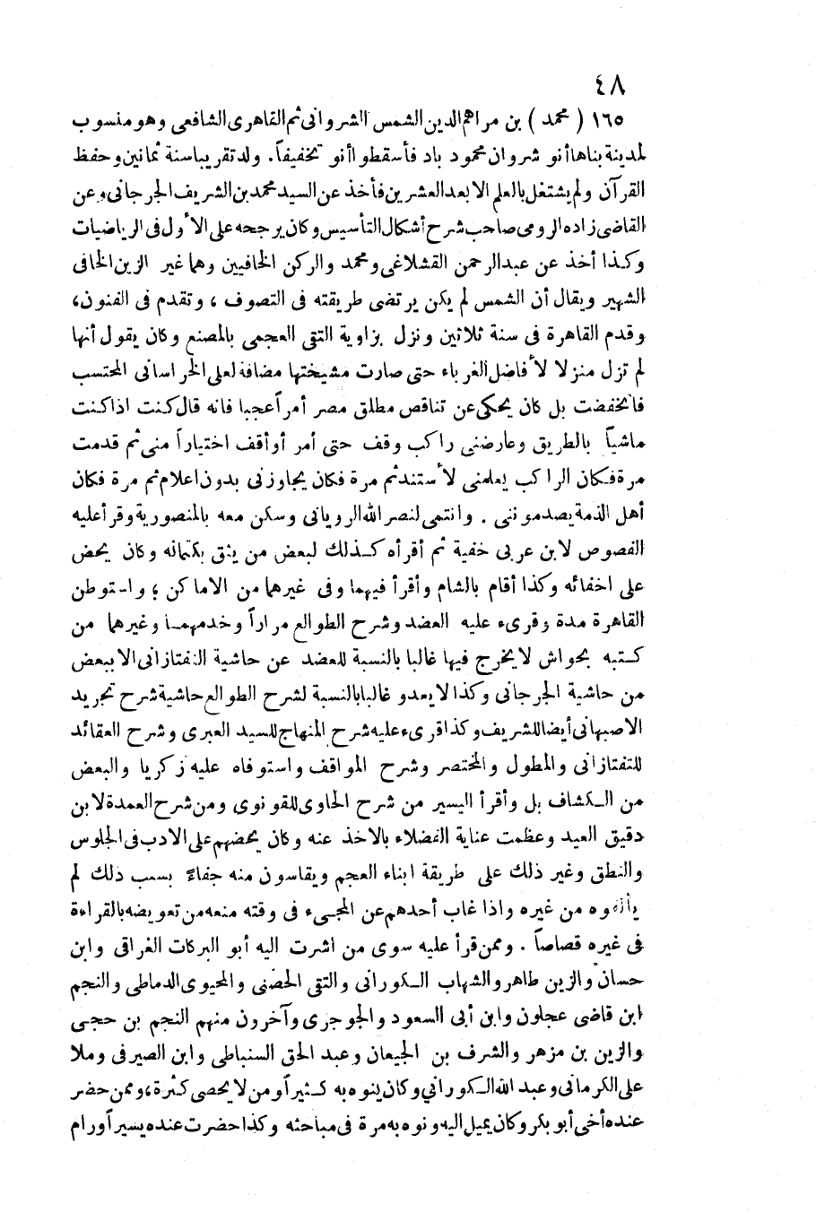 165 - مُحَمَّد بن مراهم الدّين الشَّمْس الشرواني ثمَّ القاهري الشَّافِعِي / وَهُوَ مَنْسُوب لمدينة بناها أنو شرْوَان مَحْمُود باد فأسقطوا أنو تَخْفِيفًا. ولد تَقْرِيبًا سنة ثَمَانِينَ وَحفظ الْقُرْآن وَلم يشْتَغل بِالْعلمِ إِلَّا بعد الْعشْرين فَأخذ عَن السَّيِّد مُحَمَّد بن الشريف الْجِرْجَانِيّ وَعَن القَاضِي زَاده الرُّومِي صَاحب شرح أشكال التأسيس وَكَانَ يرجحه على الأول فِي الرياضيات وَكَذَا أَخذ عَن عبد الرَّحْمَن القشلاغي وَمُحَمّد والركن الخافيين وهما غير الزين الخافي الشهير وَيُقَال أَن الشَّمْس لم يكن يرتضي طَرِيقَته فِي التصوف، وَتقدم فِي الْفُنُون، وَقدم الْقَاهِرَة فِي سنة ثَلَاثِينَ وَنزل بزاوية التقي العجمي بالمصنع وَكَانَ يَقُول أَنَّهَا لم تزل منزلا لأفاضل الغرباء حَتَّى صَارَت مشيختها مُضَافَة لعَلي الْخُرَاسَانِي الْمُحْتَسب فانخفضت بل كَانَ يَحْكِي عَن تناقص مُطلق مصر أمرا عجبا فَإِنَّهُ قَالَ كنت إِذا كنت مَاشِيا بِالطَّرِيقِ وعارضني رَاكب وقف حَتَّى أَمر أَو أَقف اخْتِيَارا مني ثمَّ قدمت مرّة فَكَانَ الرَّاكِب يعلمني لأستند ثمَّ مرّة فَكَانَ يجاوزني بِدُونِ إِعْلَام ثمَّ مرّة فَكَانَ أهل الذِّمَّة يصدمونني. وانتمى لنصر الله الرَّوْيَانِيّ وَسكن مَعَه بالمنصورية وَقَرَأَ عَلَيْهِ الفصوص لِابْنِ عَرَبِيّ خُفْيَة ثمَّ أقرأه كَذَلِك لبَعض من يَثِق بكتمانه وَكَانَ يحض على إخفائه وَكَذَا أَقَامَ بِالشَّام وأقرأ فيهمَا وَفِي غَيرهمَا من الْأَمَاكِن واستوطن الْقَاهِرَة مُدَّة وَقُرِئَ عَلَيْهِ الْعَضُد وَشرح الطوالع مرَارًا وخدمهما وَغَيرهمَا من كتبه بحواش لَا يخرج فِيهَا غَالِبا بِالنِّسْبَةِ للعضد عَن حَاشِيَة النفتازاني إِلَّا بِبَعْض من حَاشِيَة الْجِرْجَانِيّ وَكَذَا لَا يعدو غَالِبا بِالنِّسْبَةِ لشرح الطوالع حَاشِيَة شرح تَجْرِيد الْأَصْبَهَانِيّ أَيْضا للشريف وَكَذَا قرئَ)