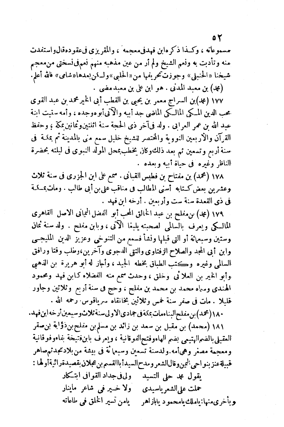 177 - مُحَمَّد بن السراج معمر بن يحيى بن القطب أبي الْخَيْر مُحَمَّد بن عبد الْقوي محب الدّين الْمَكِّيّ الْمَالِكِي / الْمَاضِي جد أَبِيه والآتي أَبوهُ وجده، وَأمه ستيت ابْنة عبد الله بن عمر العرابي. ولد فِي آخر ذِي الْحجَّة سنة اثْنَتَيْنِ وَثَمَانِينَ بِمَكَّة وَحفظ الْقُرْآن وَالْأَرْبَعِينَ النووية والمختصر للشَّيْخ خَلِيل سمع مني بِالْمَدِينَةِ ثمَّ بِمَكَّة فِي سنة أَربع وَتِسْعين ثمَّ بعد ذَلِك وَكَانَ يخْطب بِمحل المولد النَّبَوِيّ فِي ليلته بِحَضْرَة النَّاظر وَغَيره فِي حَيَاة أَبِيه وَبعده.