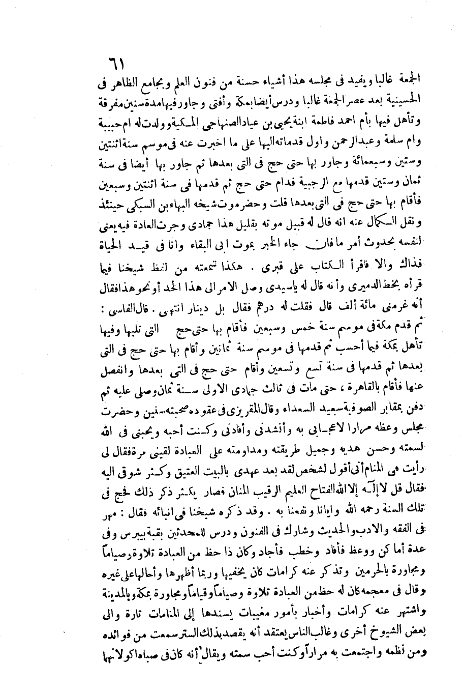 الْجُمُعَة غَالِبا ويفيد فِي مَجْلِسه هَذَا أَشْيَاء حَسَنَة من فنون الْعلم وبجامع الظَّاهِر فِي الحسينية بعد عصر الْجُمُعَة غَالِبا ودرس أَيْضا بِمَكَّة وَأفْتى وجاور فِيهَا مُدَّة سِنِين مفرقة وتأهل فِيهَا بِأم أَحْمد فَاطِمَة ابْنة يحيى بن عياد الصنهاجي المكية وَولدت لَهُ أم حَبِيبَة وَأم سَلمَة وَعبد الرَّحْمَن وَأول قدماته إِلَيْهَا على مَا أخْبرت عَنهُ فِي موسم سنة اثْنَتَيْنِ وَسِتِّينَ وَسَبْعمائة وجاور بهَا حَتَّى حج فِي الَّتِي بعْدهَا ثمَّ جاور بهَا أَيْضا فِي سنة ثَمَان وَسِتِّينَ قدمهَا مَعَ الرجبية فدام حَتَّى حد ثمَّ قدمهَا فِي سنة اثْنَتَيْنِ وَسبعين فَأَقَامَ بهَا حَتَّى حج فِي الَّتِي بعْدهَا قلت وَحضر موت شَيْخه الْبَهَاء بن السُّبْكِيّ حِينَئِذٍ وَنقل الْكَمَال عَنهُ أَنه قَالَ لَهُ قبيل مَوته بِقَلِيل هَذَا جُمَادَى وَجَرت الْعَادة فِيهِ يَعْنِي لنَفسِهِ بحدوث أَمر مَا فَإِن جَاءَ الْخَبَر بِمَوْت أبي الْبَقَاء وَأَنا فِي قيد الْحَيَاة فَذَاك وَإِلَّا فاقرأ الْكتاب على قَبْرِي. هَكَذَا سمعته من لفظ شَيخنَا فِيمَا قَرَأَهُ بِخَط الدَّمِيرِيّ وَأَنه قَالَ لَهُ يَا سَيِّدي وصل الْأَمر إِلَى هَذَا الْحَد أَو نَحْو هَذَا فَقَالَ أَنه غرمني مائَة ألف قَالَ فَقلت لَهُ دِرْهَم فَقَالَ بل دِينَار انْتهى. قَالَ الفاسي: ثمَّ قدم مَكَّة فِي موسم سنة خمس وَسبعين فَأَقَامَ بهَا حَتَّى حج الَّتِي تَلِيهَا وفيهَا تأهل بِمَكَّة فِيمَا أَحسب ثمَّ قدمهَا فِي موسم سنة ثَمَانِينَ وَأقَام بهَا حَتَّى حج فِي الَّتِي بعْدهَا ثمَّ قدمهَا فِي سنة تسع وَتِسْعين وَأقَام حَتَّى حج فِي الَّتِي بعْدهَا وانفصل عَنْهَا فَأَقَامَ بِالْقَاهِرَةِ، حَتَّى مَاتَ فِي ثَالِث جُمَادَى الأولى سنة ثَمَان وَصلي عَلَيْهِ ثمَّ دفن بمقابر الصُّوفِيَّة سعيد السُّعَدَاء وَقَالَ المقريزي فِي عقوده صحبته سِنِين وَحَضَرت مجْلِس وعظه مرَارًا لإعجابي بِهِ وأنشدني وأفادني وَكنت أحبه ويحبني فِي الله لسمته وَحسن هَدْيه وَجَمِيل طَرِيقَته ومداومته على الْعِبَادَة لَقِيَنِي مرّة فَقَالَ لي رَأَيْت فِي الْمَنَام أَنِّي أَقُول لشخص لقد بعد عهدي بِالْبَيْتِ الْعَتِيق وَكثر شوقي إِلَيْهِ فَقَالَ قل لَا إِلَيْهِ إِلَّا الله الفتاح الْعَلِيم الرَّقِيب المنان فَصَارَ يكثر ذَلِك فحج فِي تِلْكَ السّنة رَحمَه الله وإيانا ونفعنا بِهِ. وَقد ذكره شَيخنَا فِي أنبائه فَقَالَ: مهر فِي)