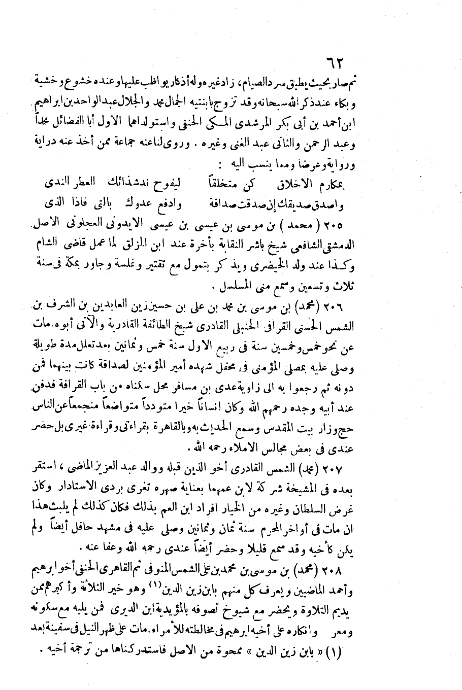 206 - مُحَمَّد بن مُوسَى بن مُحَمَّد بن عَليّ بن حُسَيْن زين العابدين بن الشّرف بن الشَّمْس الحسني الْقَرَافِيّ الْحَنْبَلِيّ القادري / شيخ الطَّائِفَة القادرية والآتي أَبوهُ. مَاتَ عَن نَحْو خمس وَخمسين سنة فِي ربيع الأول سنة خمس وَثَمَانِينَ بعد تعلل مُدَّة طَوِيلَة وَصلي عَلَيْهِ بمصلى المؤمني فِي محفل شهده أَمِير الْمُؤمنِينَ لصداقة كَانَت بَينهمَا فَمن دونه ثمَّ رجعُوا بِهِ إِلَى زَاوِيَة عدي بن مُسَافر مَحل سكناهُ من بَاب القرافة فَدفن عِنْد أَبِيه وجده رَحِمهم الله وَكَانَ إنْسَانا خيرا متوددا متواضعا منجمعا عَن النَّاس حج وزار بَيت الْمُقَدّس وَسمع الحَدِيث بِهِ وبالقاهرة بِقِرَاءَتِي وَقِرَاءَة غَيْرِي بل حضر عِنْدِي فِي بعض مجَالِس الْإِمْلَاء رَحمَه الله.