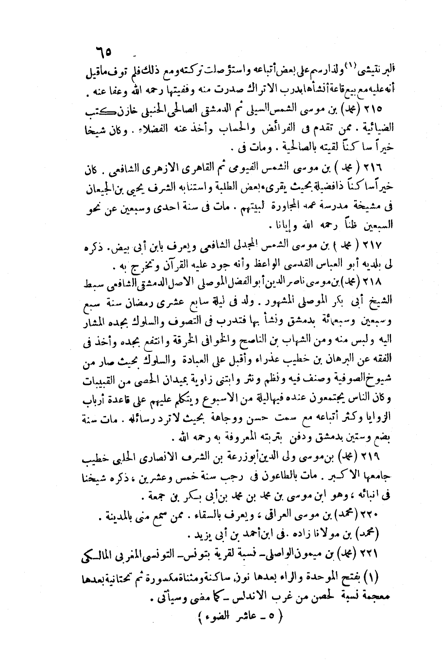 218 - مُحَمَّد بن مُوسَى نَاصِر الدّين أَبُو الْفضل الْموصِلِي الأَصْل الدِّمَشْقِي الشَّافِعِي سبط الشَّيْخ أبي بكر الْموصِلِي الْمَشْهُور. / ولد فِي لَيْلَة سَابِع عشرى رَمَضَان سنة سبع وَسبعين وَسَبْعمائة بِدِمَشْق وَنَشَأ بهَا فتدرب فِي التصوف والسلوك بجده الْمشَار إِلَيْهِ وَلبس مِنْهُ وَمن)