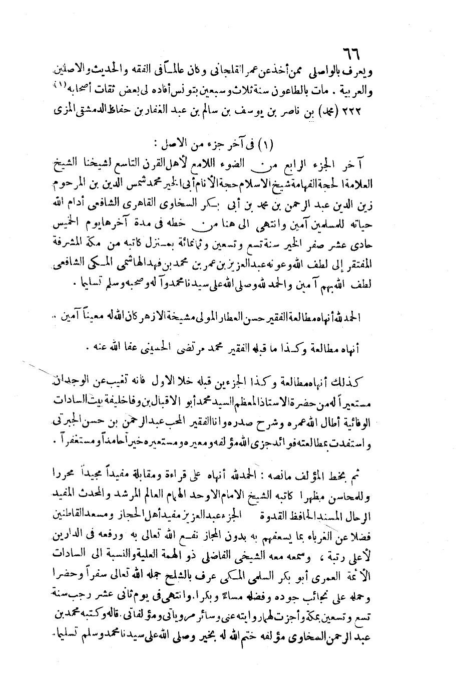 ثمَّ بِخَط الْمُؤلف مَا نَصه: الْحَمد لله أنهاه على قِرَاءَة ومقابلة مُفِيدا مجيدا محررا وللمحاسن مظْهرا كَاتبه الشَّيْخ الإِمَام الأوحد الْهمام الْعَالم المرشد والمحدث الْمُفِيد الرّحال الْمسند الْحَافِظ الْقدْوَة الْجُزْء عبد الْعَزِيز مُفِيد أهل الْحجاز ومسعد القاطنين فضلا عَن الغرباء بِمَا يسعفهم بِهِ بِدُونِ الْمجَاز نفع الله تَعَالَى بِهِ وَرَفعه فِي الدَّاريْنِ لأعلى رُتْبَة، وسَمعه مَعَه الشيخي الفاضلي ذُو الهمة الْعلية وَالنِّسْبَة إِلَى السادات الْأَئِمَّة الْعمريّ أَبُو بكر السّلمِيّ الْمَكِّيّ عرف بالشلح جمله الله تَعَالَى سفرا وحضرا وَحمله على نَجَائِب جوده وفضله مسَاء وبكرا. وانْتهى فِي يَوْم ثَانِي عشر رَجَب سنة تسع وَتِسْعين بِمَكَّة وأجزت لَهما رِوَايَته عني وَسَائِر مروياتي ومؤلفاتي. قَالَه وَكتبه مُحَمَّد بن عبد الرَّحْمَن السخاوي مُؤَلفه ختم الله لَهُ بِخَير وَصلى الله على سيدنَا مُحَمَّد وَسلم تَسْلِيمًا.