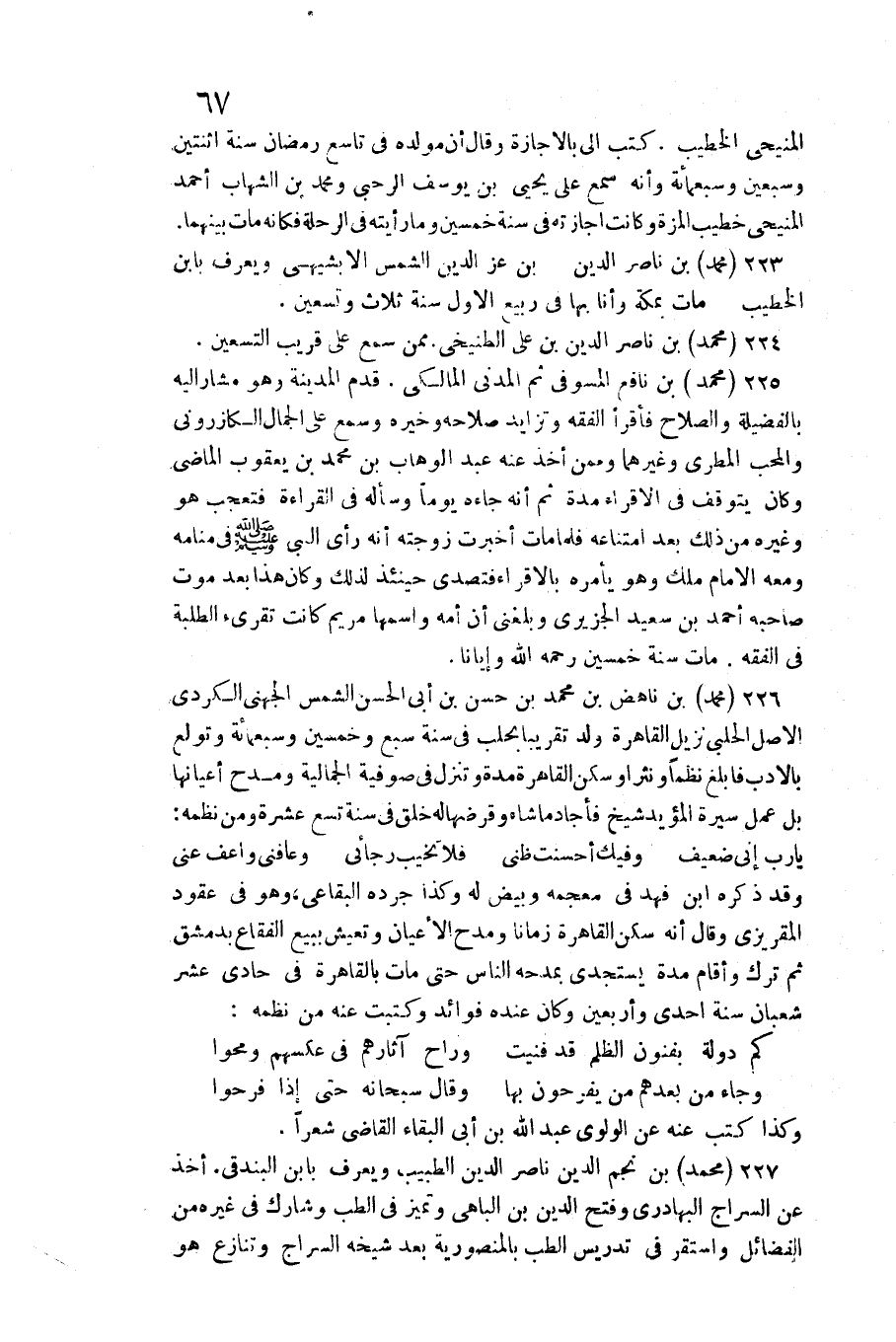 227 - مُحَمَّد بن نجم الدّين نَاصِر الدّين الطَّبِيب وَيعرف بِابْن البندقي. / أَخذ عَن السراج البهادري وَفتح الدّين بن الباهي وتميز فِي الطِّبّ وشارك فِي غَيره من الْفَضَائِل وَاسْتقر فِي تدريس الطِّبّ بالمنصورية بعد شَيْخه السراج وتنازع هُوَ