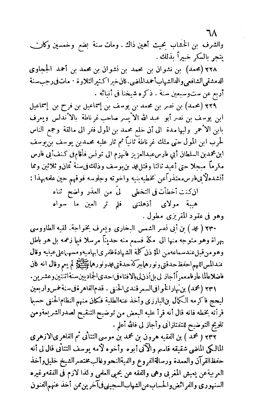 231 - مُحَمَّد بن نَهَار الخوافي السَّمرقَنْدِي الْحَنَفِيّ. / قدم الْقَاهِرَة فِي سنة خمس وَأَرْبَعين ليحج فَأكْرمه الْكَمَال بن الْبَارِزِيّ وَأخذ عَنهُ الطّلبَة فَكَانَ مِنْهُم النظام الْحَنَفِيّ حَسْبَمَا قرأته بِخَطِّهِ فَإِنَّهُ قَالَ أَنه قَرَأَ عَلَيْهِ الْبَعْض من توضيح التَّنْقِيح لصدر الشَّرِيعَة وَمن تلويح التَّوْضِيح للتفتازاني وَأَجَازَ لي فَالله أعلم.