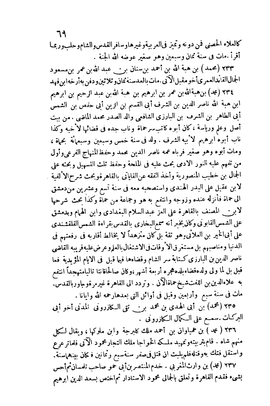234 - مُحَمَّد بن هبة الله بن عمر بن إِبْرَهِيمُ بن هبة الله بن عبد الرَّحِيم بن إِبْرَهِيمُ بن هبة الله نَاصِر الدّين بن الشّرف بن الْبَارِزِيّ الشَّافِعِي وَالِد الصَّدْر مُحَمَّد الْمَاضِي. / من بَيت أصل وَعلم ورياسة، كَانَ أَبوهُ كَاتب سر حماة وناب جده فِي قَضَائهَا لِأَخِيهِ وَكَذَا نَاب أَبوهُ إِبْرَهِيمُ لِأَبِيهِ الشّرف. ولد فِي سنة خمس وَسبعين وَسَبْعمائة بحماة، وَمَات أَبوهُ وَهُوَ صَغِير فرباه عَمه)