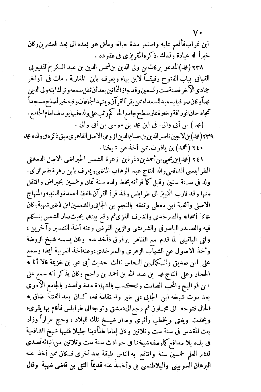 238 - مُحَمَّد الْمَدْعُو بَرَكَات بن ولي الدّين بن شمس الدّين بن عبد الْكَرِيم القليوبي القباني بِبَاب الْفتُوح رَفِيقًا لِابْنِ بهاء وَيعرف بِابْن المغاربة. / مَاتَ فِي أَوَاخِر جُمَادَى الْآخِرَة سنة سِتّ وَتِسْعين وَقد جَازَ الثَّمَانِينَ بعد أَن ثقل سَمعه وَترك ابْنه ولي الدّين مُحَمَّدًا وَكَانَ صوفيا بِسَعِيد السُّعَدَاء مِمَّن يقْرَأ الْقُرْآن وَيشْهد الْجَمَاعَات وَفِيه خير أصلح مَسْجِدا تجاه خَان الوراقة وخلوة)