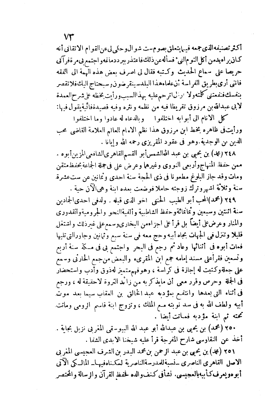 251 - مُحَمَّد بن يحيى بن عبد الرَّحْمَن بن مُحَمَّد الْبَدْر بن الشّرف العجيسي المغربي الأَصْل القاهري الناصري نِسْبَة للمدرسة الناصرية لسكناه فِيهَا الْمَالِكِي الْآتِي أَبوهُ وَيعرف كأبيه بالعجيسي. / نَشأ فِي كنف وَالِده فحفظ الْقُرْآن والرسالة والمختصر