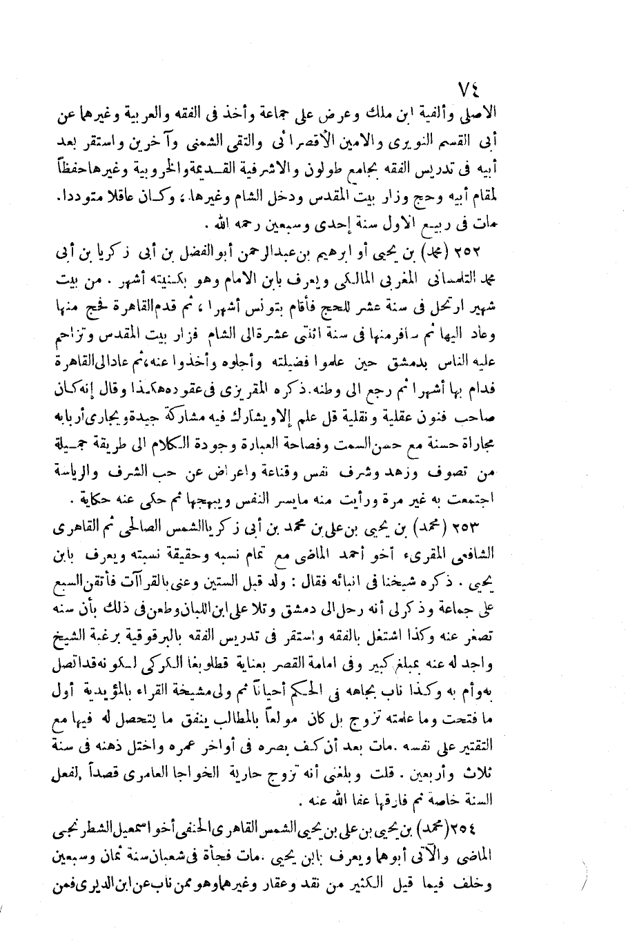 252 - مُحَمَّد بن يحيى أَو إِبْرَهِيمُ بن عبد الرَّحْمَن أَبُو الْفضل بن أبي زَكَرِيَّا بن أبي مُحَمَّد التلمساني المغربي الْمَالِكِي وَيعرف بِابْن الإِمَام / وَهُوَ بكنيته أشهر. من بَيت شهير ارتحل فِي سنة عشر لِلْحَجِّ فَأَقَامَ بتونس أشهرا، ثمَّ قدم الْقَاهِرَة فحج مِنْهَا وَعَاد إِلَيْهَا ثمَّ سَافر مِنْهَا فِي سنة اثْنَتَيْ عشرَة إِلَى الشَّام فزار بَيت الْمُقَدّس وتزاحم عَلَيْهِ النَّاس بِدِمَشْق حِين علمُوا فضيلته وأجلوه وَأخذُوا عَنهُ، ثمَّ عَاد إِلَى الْقَاهِرَة فدام بهَا أشهرا ثمَّ رَجَعَ إِلَى وَطنه. ذكره المقريزي فِي عقوده هَكَذَا وَقَالَ إِنَّه كَانَ صَاحب فنون عقلية ونقية قل علم إِلَّا ويشارك فِيهِ مُشَاركَة جَيِّدَة ويجاري أربابه مجاراة حَسَنَة مَعَ حسن السمت وفصاحة الْعبارَة وجودة الْكَلَام إِلَى طَريقَة جميلَة من تصوف وزهد وَشرف نفس وقناعة وإعراض عَن حب الشّرف والرياسة اجْتمعت بِهِ غير مرّة وَرَأَيْت مِنْهُ مَا يسر النَّفس ويبهجها ثمَّ حكى عني حِكَايَة.