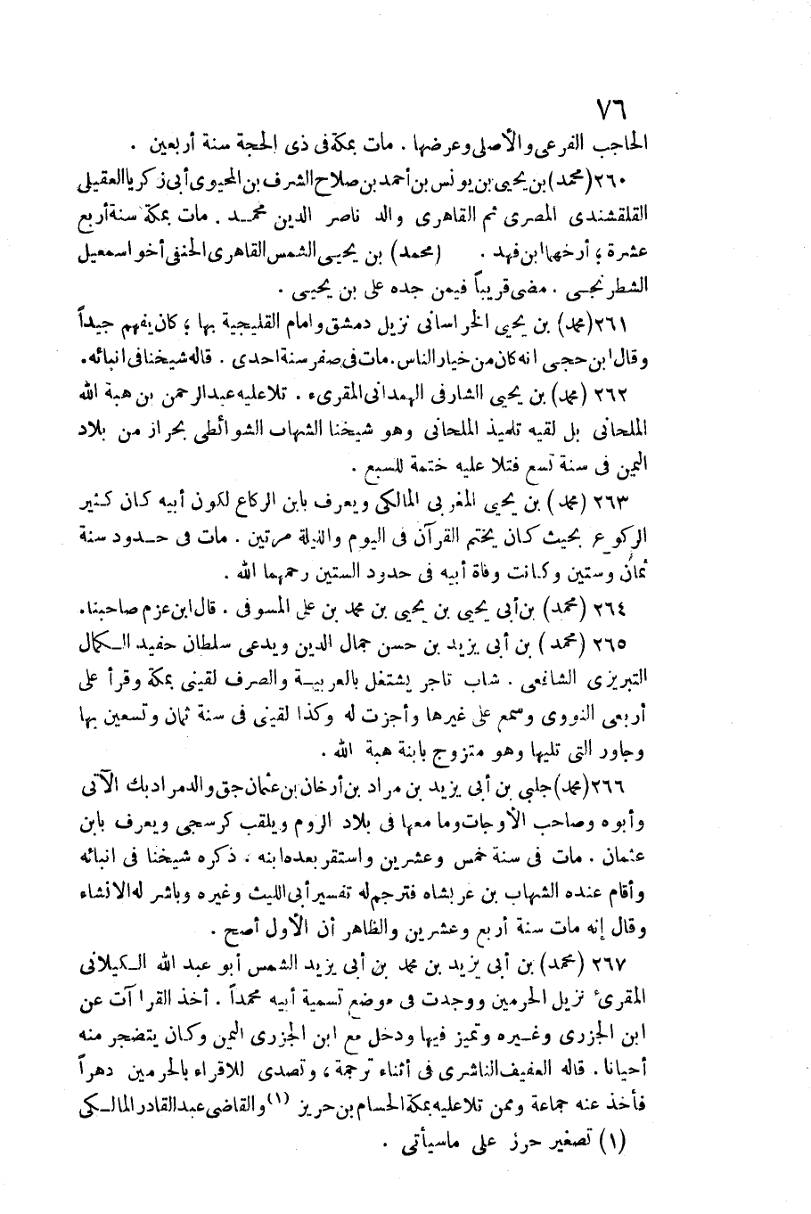 262 - مُحَمَّد بن يحيى الشارفي الْهَمدَانِي الْمُقْرِئ. / تَلا عَلَيْهِ عبد الرَّحْمَن بن هبة الله الملحاني بل لقِيه تلميذ الملحاني وَهُوَ شَيخنَا الشهَاب الشوائطي بحراز من بِلَاد الْيمن فِي سنة تسع فَتلا عَلَيْهِ ختمة للسبع.