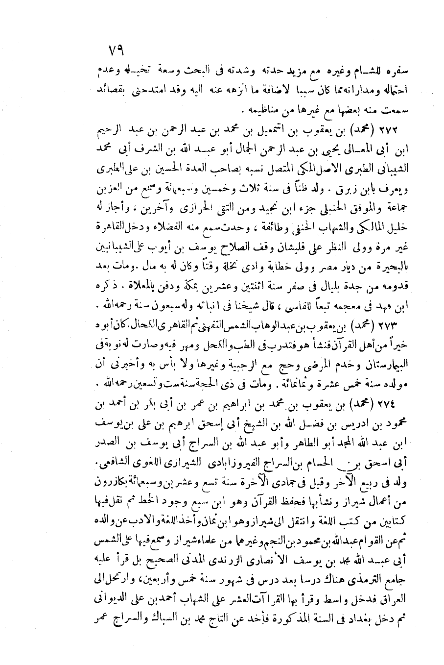 273 - مُحَمَّد بن يَعْقُوب بن عبد الْوَهَّاب الشَّمْس التفهني ثمَّ القاهري الكحال. / كَانَ أَبوهُ خيرا من أهل الْقُرْآن فَنَشَأَ هُوَ فتدرب فِي الطِّبّ والكحل وَمهر فِيهِ وَصَارَت لَهُ نوبَة فِي البيمارستان وخدم المرضى وَحج مَعَ الرجبية وَغَيرهَا ولابأس بِهِ وَأَخْبرنِي أَن مولده سنة خمس عشرَة وَثَمَانمِائَة. وَمَات فِي ذِي الْحجَّة سنة سِتّ وَتِسْعين رَحمَه اللهز