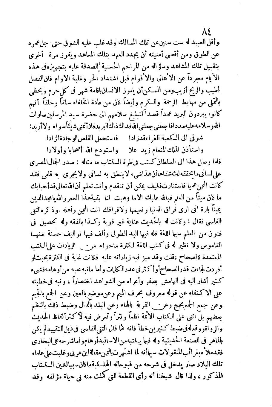 وَأَقل العبيد لَهُ سِتّ سِنِين عَن تِلْكَ المسالك وَقد غلب عَلَيْهِ الشوق حَتَّى جلّ عمره عَن الطوق وَمن أقْصَى أمْنِيته أَن يجدد الْعَهْد بِتِلْكَ الْمعَاهد ويفوز مرّة أُخْرَى بتقبيل تِلْكَ الْمشَاهد وسؤاله من المراحم الحسنية الصَّدَقَة عَلَيْهِ بتجهيزه فِي هَذِه الْأَيَّام مُجَردا عَن الأهالي والأقوامقبل اشتداد الْحر وَغَلَبَة الأوام فَإِن الْفَصْل أطيب وَالرِّيح أزيب وَمن الْمُمكن أَن يفوز الْإِنْسَان بِإِقَامَة شهر فِي كل حرم ويحظى بالتملي من مهابط الرَّحْمَة وَالْكَرم وَأَيْضًا كَانَ من عَادَة الْخُلَفَاء سلفا وخلفا أَنهم كَانُوا يبردون الْبَرِيد عمدا قصدا لتبليغ سلامهم إِلَى حَضْرَة سيد الْمُرْسلين صلوَات الله وَسَلَامه عَلَيْهِ مدَدا فَاجْعَلْنِي جعلني الله فدَاك ذَاك الْبَرِيد فَلَا أَتَمَنَّى شَيْئا سواهُ وَلَا أُرِيد: